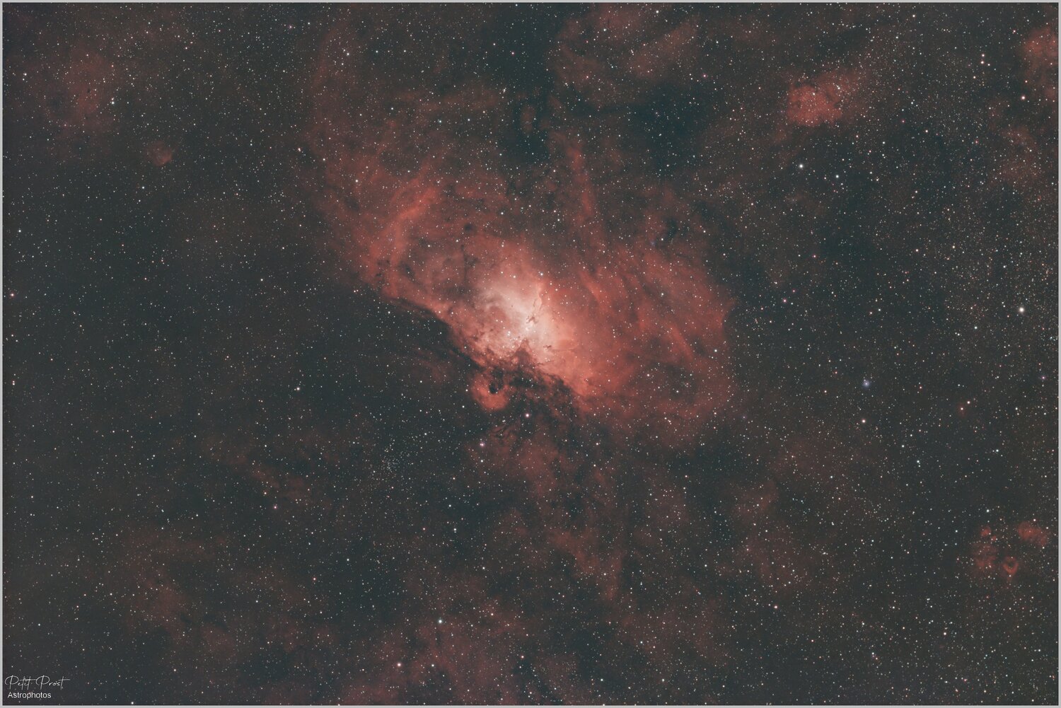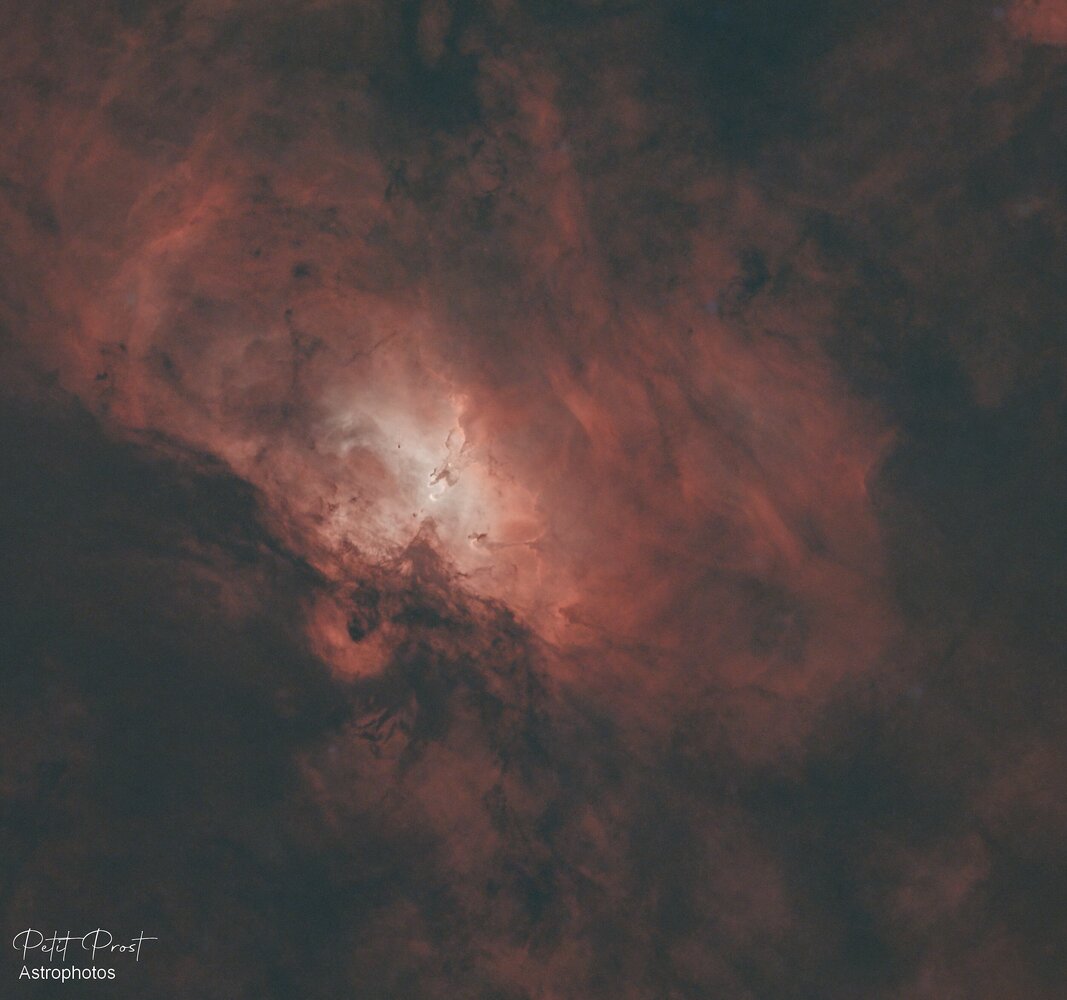 2. Bonjour à Tous , La saison des nébuleuses commence avec M-16 que je n'avais pas ciblé depuis 2018 . A l'époque c'était avec une Atik 383L mono en H-Alpha . Il était temps de retenter l'aventure qui s'est déroulé sur trois nuits , cible assez basse à l'horizon juste au dessus des arbres et non loin du méridien avec le haut du mur coté sud de l'observatoire . Askar FRA400 , PlayerOne Posseidon-C , filtre ALP-T 55 poses de 240sec Pretraitement Siril et Traitement PIX Zoom sur le cœur de la nébuleuse : Souvenir de 2018 Eric