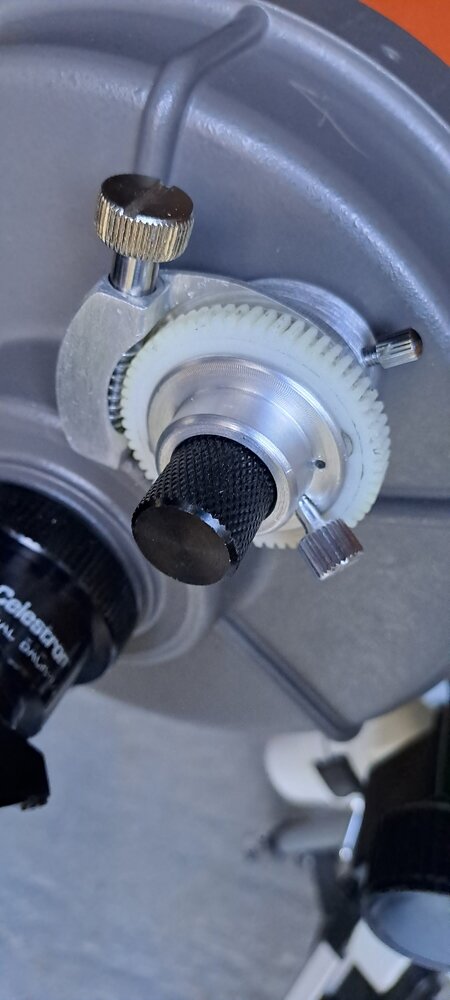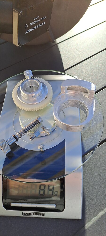 salut à tous , pour les bricoleurs si vous avez un C8 ou autres tube avec le même système de mise au point et que votre MAP n'est pas assez précise à votre goût, voici un petit bricolage pour avoir plus de précision lors de la mise au point . j'ai utilisé un module d'engrenage de moteur d'essuie glace de voiture (vis sans fin et couronne en plastique ) le support de la vis et le moyeu sont en aluminium usinés avec un petit tour d'établi poids total 84gr mais on peut aussi les fabriquer à l'aide d'une imprimante 3D. Ici, j'ai un rapport de 55 tours de molette de la vis sans fin pour 1 tour de molette d'origine du C8. un autre avantage, la MAP est autobloquante par ce système d'entrainement. en p.jtes une vidéo du fonctionnement avec ou sans démultiplication. Bon bricolage à vous Mario 20230925_193406.mp4 -