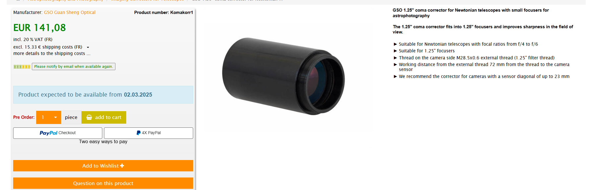 Pour l'instant la camera sera une imx464, et j'évoluerais surement vers un capteur refroidi type 585 ou 533, mais pas plus grand.