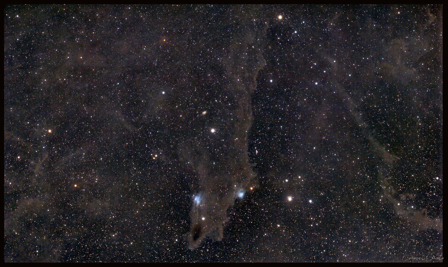 Hello tout le monde ! 🖐️ Un nébuleuse sombre....en principe des ciels sombres. Ce requin là navigue en eau profonde, pas facile à voir....mais bon, je me suis dit que je pourrais essayer à mon tour, dans mon ciel bordelais (BTL7). J'ai fait un 1er essai à 30 min puis traiter pour voir si qqchose apparaissait et à ma grande surprise...on commençait à distinguer la tête, j'ai donc validé le cadrage et le fait que j'allais poursuivre la traque de ce sélachimorphe. Donc, le setup : Askar FRA400 (F5.6) Canon 6D defiltré Monture Skywatcher GTI Asiair Plus (utile pour bien cadrer le bestiau) 15h30 env de pose sur 5 nuits, 930x1min non guidées (malheureusement de qualité inégale dû à la transparence du ciel plutôt variable) Traitement SIRIL + PS (avec DOF bien sûr). -