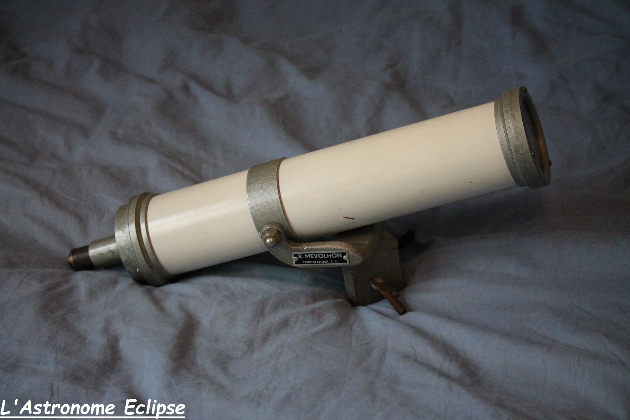 Bonjour à toutes et à tous, Attention, topic 100% franco-vintage en approche... Je m'apprête à vous parler d'un télescope construit par un astronome aujourd'hui méconnu, alors qu'il était très célèbre en son temps. Les astrams de moins de 30 ans ne l'ont probablement pas connu, et ceux de plus de 30 ans en parlent très rarement... J'ai récemment acquis un tout petit télescope: il s'agit d'un Cassegrain de 90mm de diamètre, installé sur une monture à fourche de type Magellan. Je n'ai pas encore mesuré la focale mais je pense qu'elle est comprise entre 1200 et 1500 mm. Cet instrument a été construit par... l'astronome Robert Mevolhon, jadis situé à Forcalquier! Avant d'aller plus loin, voici quelques photos: Je n'ai pas connu Robert Mevolhon et ai donc mené quelques recherches. Internet ne donne que très peu d'informations ( 1 info sur 2 se trouve d'ailleurs sur Webastro et Astrosurf!). Monsieur Mevolhon a travaillé à l'Observatoire de Haute Provence (OHP) dans les années 60. Il disposait paraît-il de son propre atelier d'optique. Les astronomes qui l'ont connu disent que ce monsieur aimait le travail bien fait: les instruments qui sortaient de son atelier étaient toujours d'une qualité irréprochable, aussi bien en terme d'optique que de mécanique. Certains de ces instruments n'ont été construits qu'en un ou deux exemplaires. Robert Mevolhon est également à l'origine de la société Sécia (implantée à Manosque). J'ai aussi croisé le nom de Sud-Optique, alias l'ancien nom de Sécia... Il est bon de savoir que Robert Mévolhon, outre sa maîtrise des lois de l'optique, fréquentait des personnalités comme Danjon, Couder, Clavé, Texereau. Dans les années 50, il a également contribué à l'achat initial de la lunette du père Josset pour le compte de l'industriel Léon Guintrand. Si au passage vous avez d'autres informations sur Mevolhon et ses télescopes je suis preneur. Si certains d'entre vous l'ont même connu et souhaitent apporter un témoignage ce serait encore mieux! Pour en revenir à mon "nouveau" télescope, j'envisage de l'installer sur un trépied en bois. Les rares photos d'instruments Mevolhon montrent que les trépieds d'origine étaient souvent en métal. Toutefois, je pense qu'un trépied en bois apporte une note de nostalgie comme on l'aime dans le club Vintage! Cela donne un certain cachet aux instruments et mon "petit télescope blanc" mérite d'être chouchouté... En terme d'observation, je n'ai pas encore pu le tester. L'aluminure du miroir primaire est faite à l'ancienne et accuse son âge: elle se détache très facilement! Je n'y touche pas pour le moment afin de conserver le télescope dans son jus. Son état moyen n'empêche pas d'utiliser l'instrument. On notera que le miroir primaire porte l'inscription "Très Bon" sur sa tranche, ce qui m'a rendu très enthousiaste lorsque je l'ai découverte! Le porte-oculaire, quant à lui, est fixe: pas de mise au point possible! L'oculaire fourni de base a été conçu spécialement pour ce télescope, et sa position est donc calculée avec précision. Pour refaire la mise au point, il suffit de tirer ou pousser l'oculaire. Le coulant est atypique (22mm). Il est possible d'utiliser des accessoires au coulant 27mm moyennant un tube adaptateur Clavé; les oculaires en 27mm peuvent donc convenir mais se situent un tout petit peu trop loin du foyer. L'adaptateur Clavé est donc trop long. A charge pour moi de trouver un tube plus court... La monture est rudimentaire mais efficace. Le télescope garde sa position par un simple serrage. Je ne manquerai pas de vous parler de ses performances lorsque j'aurai pu le tester. A suivre! Merci de m'avoir lu! Astro-amicalement, Astropleiades -