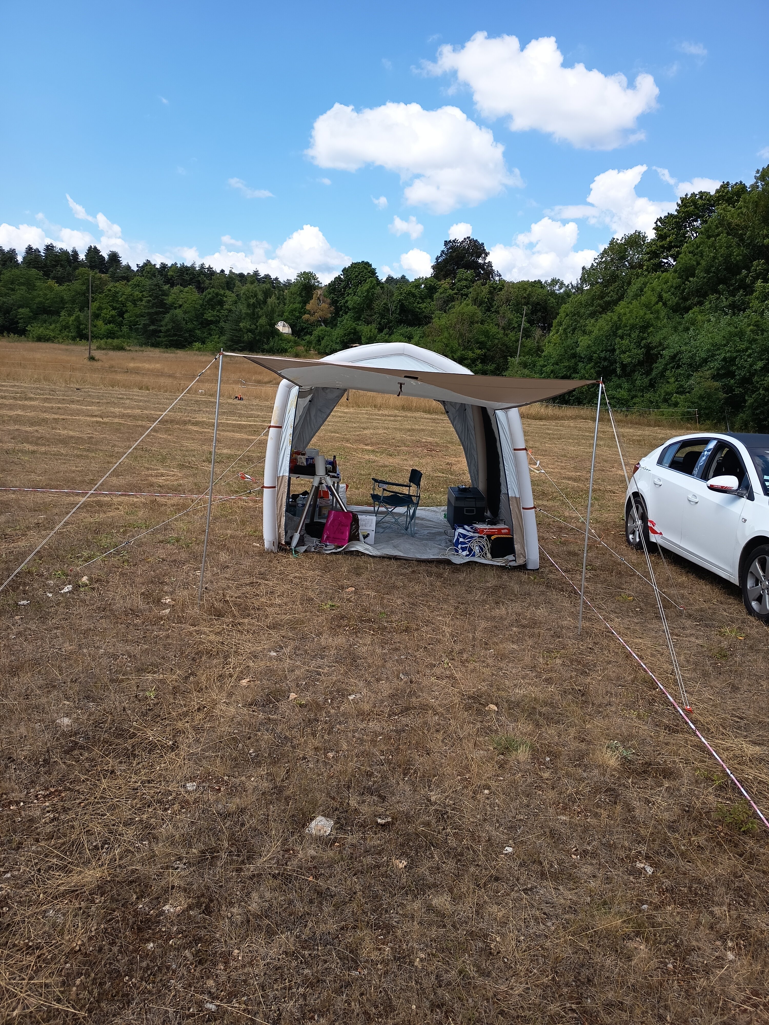 Je suis plus tout seul si je peux dire j'ai un astram côté visuel qui est arrivé vers 19h avec un jolie 400mm Les places à l'ombre vont être chère cette année j'ai mis une tente côté astro photos pour pouvoir dormir jusqu'à midi et une autre tente côté visuel pour faire la sieste l'après midi comme c'est à l'ombre.... -