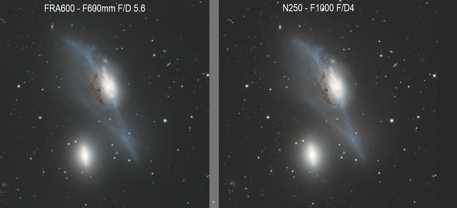 22. Bon je me permet un petit prtage car j'ai fait la même image avec la FRA600 Voici donc 2 images que j'ai faites du même objet et rapporté à la plus Grande focale à savoir à celle du Newton (1000mm) L'une avec ma lunette de 108mm de diamètre pour 600mm de focale et l'autre avec le newton 250mm de diamètre pour 1000mm de focale. Il y à bien une différence de détails d'autant plus que l'image à 600mm à été upscale mais vraiment la FRA600 se défend bien ! L'image complète à la FRA600 Et Quelques Crop