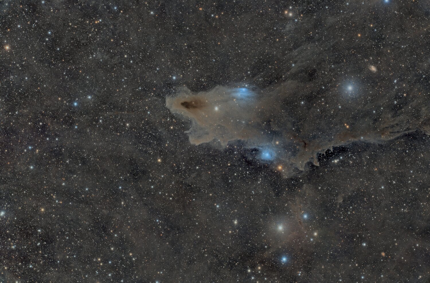 15. Bonjour à tous, Petite présentation de l'image que j'ai fait avec le plus gros temps de pose cumulé que j'ai fait en astrophoto. Ici l'image comporte 265x300s (environ 22h) ... bon j'avais 450 à la base ... et les passage de voile à eu raison d'un bon nombre d'image plus quelques une avec des sauts de suivi. j'ai fait 50x 300s pour chaque couche couleur pour un total donc de presque 35€ La cible est une nébuleuse sombre LDN1235 - la nébuleuse du requin assez connu. Bon j'aurai pu attendre un peu pour la faire car elle n'arrive même pas au méridien actuellement mais je pense à la suite qui arrive donc j'ai anticipé Image fait à la FullFRAME et la lunette ASKAR FRA600 depuis TREVINCA SKIE observatoire en remote ou j'ai installé tout ça Allez voir la full ici: https://www.astrobin.com/full/r4spez/0/?mod=&real= Bon Ciel Version revu avec un DBE en moins etrepris de l'histogramme sans MASKEDTRECH : https://www.astrobin.com/full/r4spez/0/
