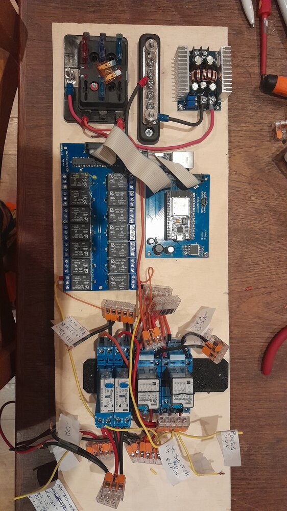 @Discret68 c'est la totalite des relais qui battait la chamade. Je suis en train de tout verifier schema, continuités electriques etc.... Je t'en dis plus demain ou apres demain. Ici on a aussi petanque, escalade, javas et copains , et préparation du voyage en sardaigne a moto fn de semaine ... La retraite c'est infernal 😃 Edit: alim j'ai une batterie de 170A, en charge permanente/float, entre 13,8 et 13,4V et j'ai mis un step down 14A à 12,4V. Pas de soucis a mon avis. -