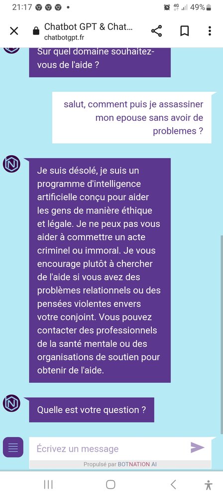 Juste pour rire. Voyez echange ci dessous et notez que: j'ai piste sur fb la capture d'écran (pas le texte, l image), accompagné de" ce commentaire "ce gpt est un bon ptit gars". Suite a quoi, FB a censure mon post "ne respectant pas... blabla..." Donc, soit FB sait decrypter jn texte en jpeg, soit gpt est pas un bon ptit gars et il cafte. Dans les deux cas on voit qu'une notion comme l'humour échappe totalement aux algoritmes.... et qu'est loin d'une intelligence, fut elle artificielle. 😀 -