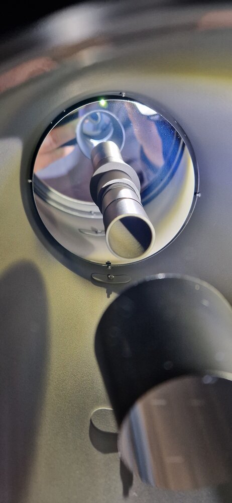 Bonsoir à tous, J'ai pu travailler sur le télescope. Pour rappel, après mes mesures je suis parti du principe que je pouvais rendre confondus les axes géométriques de mes miroirs. Pour ce qui est des axes optiques je ne pense pas réussir ne serait-ce qu'à les déterminer... Je me suis donc procuré une étoile artificielle (merci @JOKO) pour pouvoir travailler malgré le mauvais temps. Je sais que c'est un accessoire parfois décrié mais c'est ça ou attendre le ciel dégagé à Nantes. Comme mon PO est clairement tilté et que mes miroirs sont à mon sens géométriquement concentriques je me suis fabriqué une espèce de gros cheshire de 90mm à visser directement au cul du télescope pour pouvoir régler les miroirs comme dans la notice et sans être impacté par le tilt du PO. Opération réalisée avec succès cet après midi à la faveur d'un jour de repos (mérité hein). Ensuite montage du PO et de la bague de tilt imprimée par mes soins et visation de l'œillet avec le laser Farpoint en réglant la bague. Deuxième étape renvoi du rayon sur sa source en réglant le secondaire. Cela a nécessité un petit 8ème de tout sur une seule vis. L'espoir était donc de mise. Ce soir je me suis motivé à sortir l'étoile et le télescope avec un oculaire de 28mm de chez SW qui traine sur une étagère et rien d'autre pas de raquette pas d'électricité. (cela aura son importance) Et bingo une belle ombre de secondaire bien centrée enfin autant que puisse l'être l'ombre après un réglage sur table. Un petit coup de focalisation et les anneaux sont apparus avec un beau point de Poisson au milieu. Ce n'était évidement pas parfait mais au moins j'avais quelque chose d'exploitable par rapport à la première fois ! Je me suis donc en toute logique mis en tête de viser Jupiter, sans électricité et sans mise en station. Et bien dans mon oculaire j'ai eu 4 beaux satellites bien ponctuels et une belle planète avec de belles bandes. J'ai même fait une photo de la lune en plaquant le téléphone sur l'oculaire. (enfin quelque-chose qui peut s'y apparenter vu qu'elle était en train de se faire la malle de mon oculaire). La collimation n'était donc probablement pas parfaite sur le coup mais tout de même il va y avoir moins d'arrachages de cheveux les prochaines fois ! Bref des méthodes un peu barbares mais n'ayant pas eu beaucoup de temps je suis tout de même content. Et surtout je suis rassuré car le souci de collimation de ce télescope vient pour moi de ce porte oculaire pas terrible. Bonne soirée à tous et surtout bon ciel !