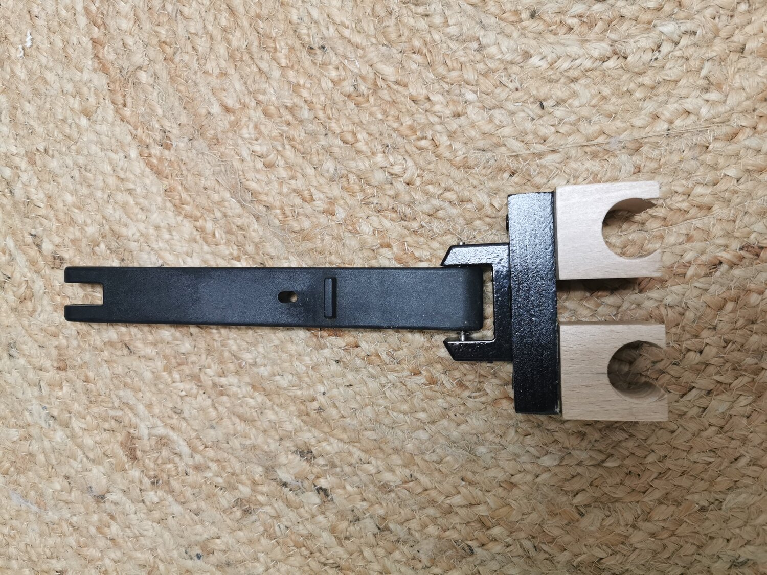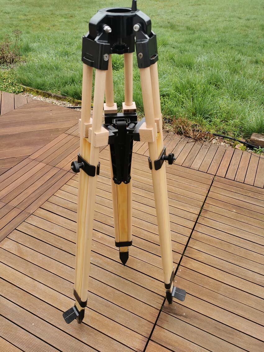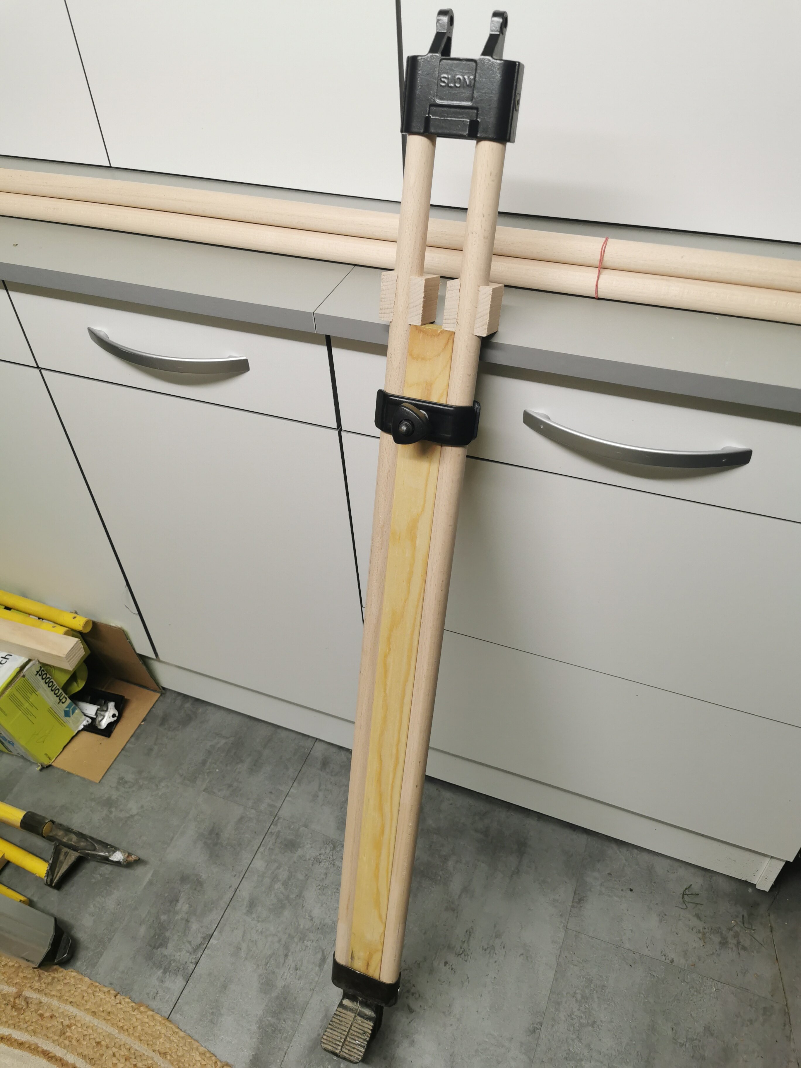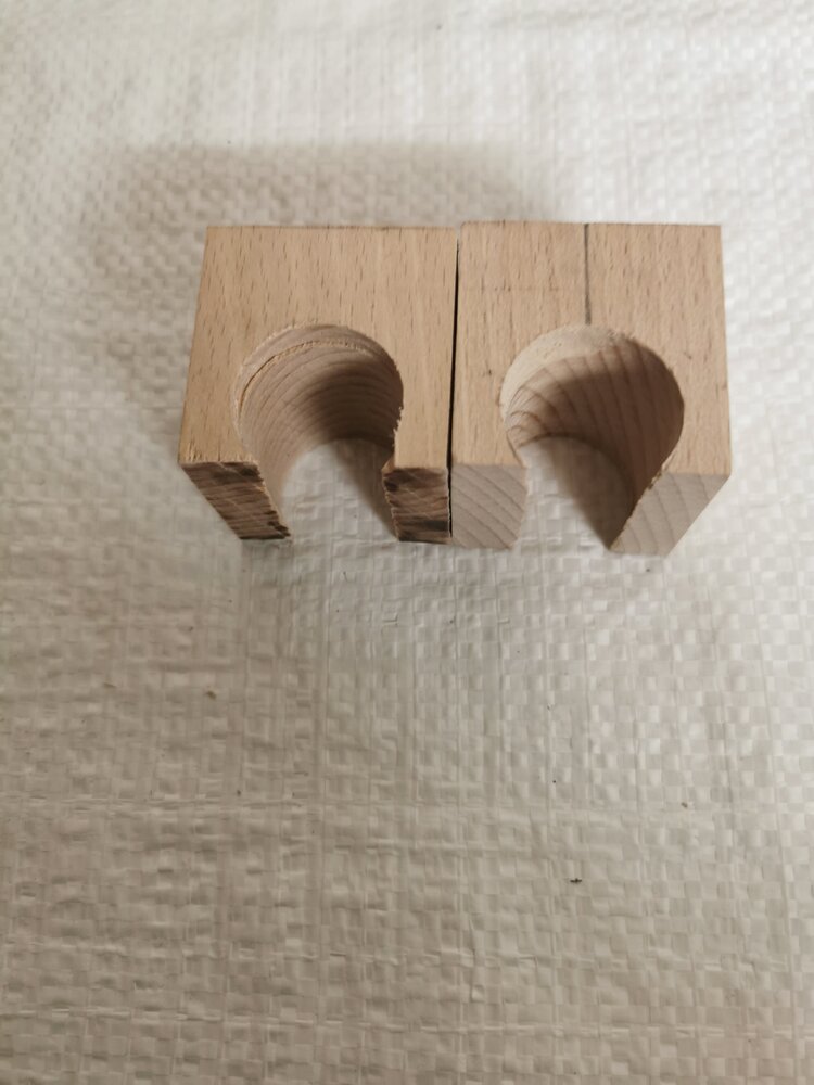 ON attaque maintenant la partie bois, tout d'abord les ronds. Il faut réduire le diamètre à 24mm la partie basse sur 4 cm de longueur, faire de même sur la partie haute sur 6 cm. Ainsi, il est possible d'insérer les ronds dans les parties métalliques hautes et basses. Faire un montage à blanc pour vérifier. Il est aussi nécessaire de modifier la courbure du rond sur un bon tier de la circonférence afin qu'il puisse parfaitement coulisser sur la partie centrale du pied, même avec un léger jeu car il faut tenir compte des 3 couches de vitrificateur. Point important, bien repérer avec une trace de crayon la partie de courbure modifiée, cette partie doit se trouver vers l'intérieure du support de platine. Refaire un montage à blanc pour repérer et percer l'emplacement des vis pour le montage des supports de platine et la vis pour la partie basse. Il reste maintenant à faire le montage pour recevoir le parapluie. Pour cela, couper dans le carré de 40x40, des cubes de 40x40x40. Sur l'une des faces, tracer un axe milieu. A 8mm de l'arête, sur la ligne, donner un coup de poinçon. A l'aide d'une perceuse colonne et d'une mèche bois plate de 25mm, percer un trou traversant. Réaliser 6 pièces, elles devront pouvoir coulisser sur les ronds. Faire un essai. joindre par une pièce de bois, 2 de ces pièces avec le bon écartement afin qu'elles puissent parfaitement coulisser sur les deux ronds de chaque pieds. Sur chacun de ces ensembles, center les supports du parapluie et fixer à l'aide de vis. Refaire un montage à blanc pour chaque pied afin de vérifier que tout coulisse correctement. Tout démonter pour le passage des 3 couches de vitrificateur. Attendre une semaine avant de tout remonter. Toutes les pièces métalliques ont été repeintes en noir martelé.
