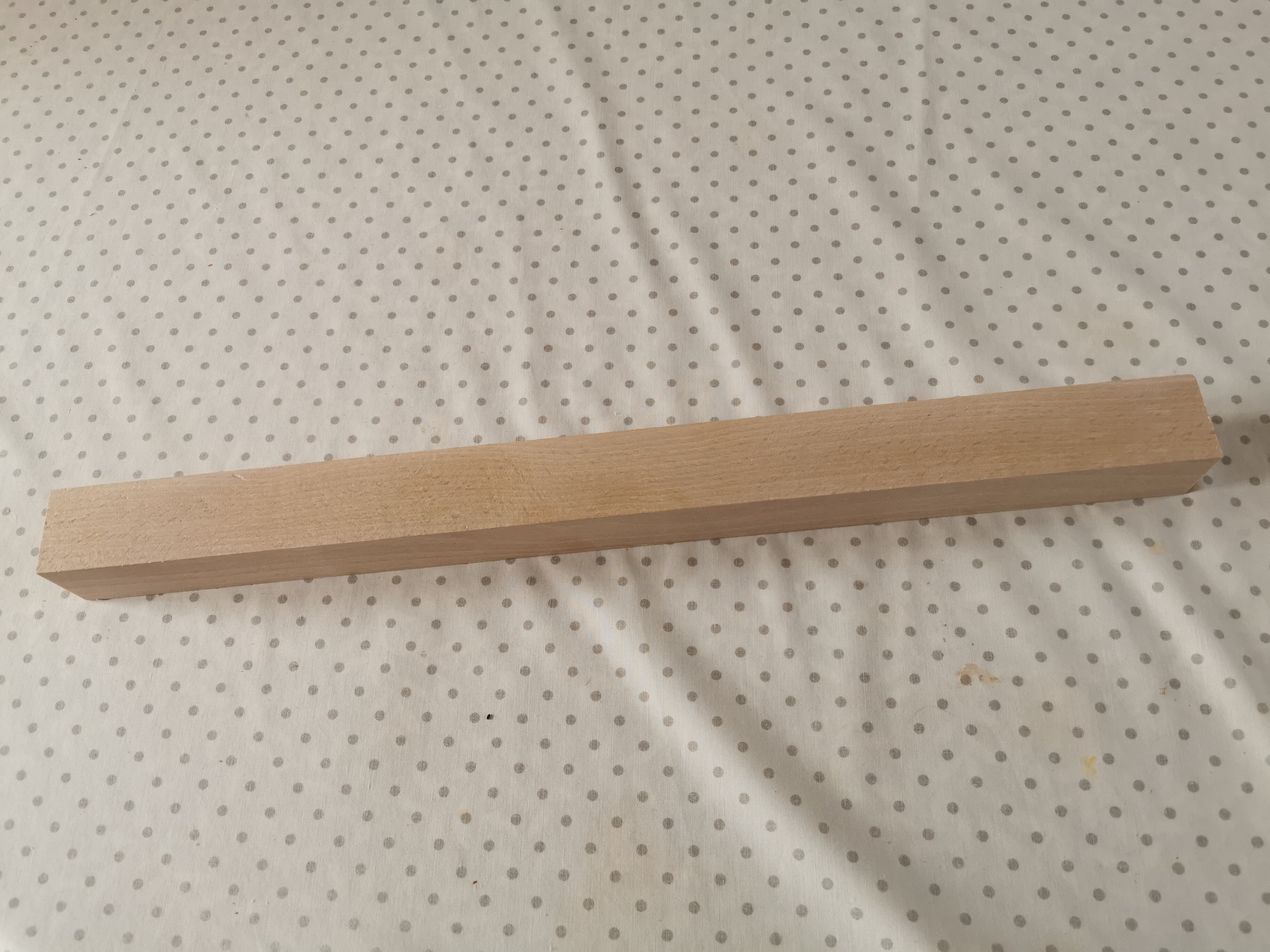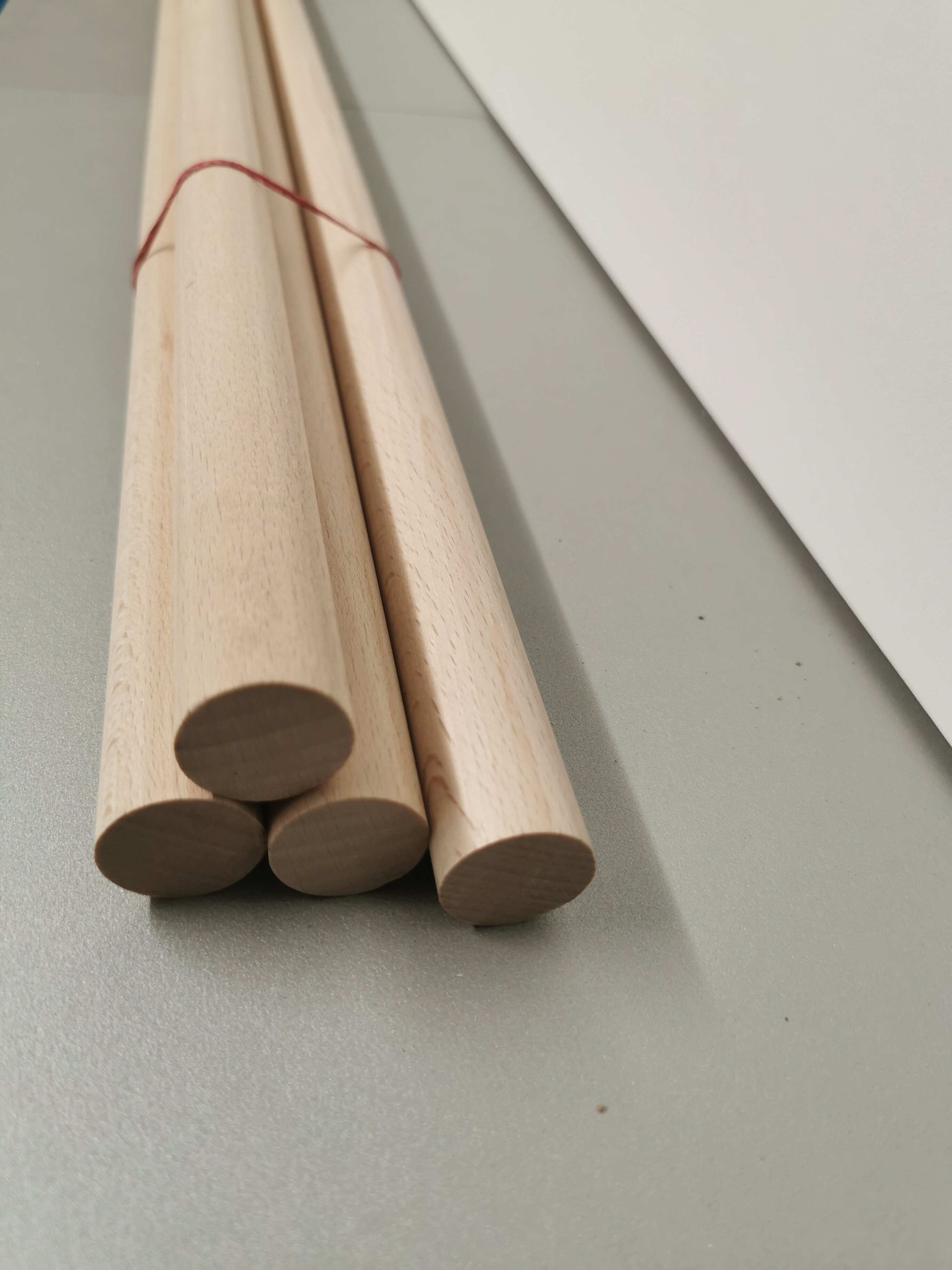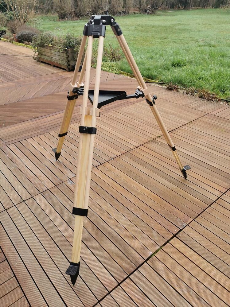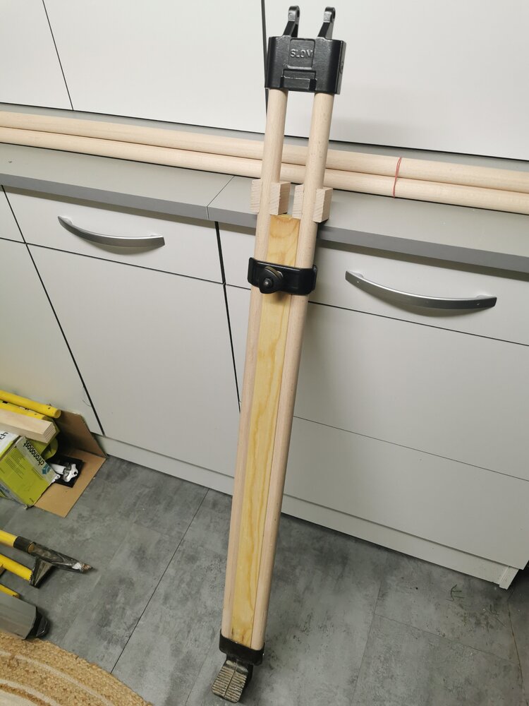 ON attaque maintenant la partie bois, tout d'abord les ronds. Il faut réduire le diamètre à 24mm la partie basse sur 4 cm de longueur, faire de même sur la partie haute sur 6 cm. Ainsi, il est possible d'insérer les ronds dans les parties métalliques hautes et basses. Faire un montage à blanc pour vérifier. Il est aussi nécessaire de modifier la courbure du rond sur un bon tier de la circonférence afin qu'il puisse parfaitement coulisser sur la partie centrale du pied, même avec un léger jeu car il faut tenir compte des 3 couches de vitrificateur. Point important, bien repérer avec une trace de crayon la partie de courbure modifiée, cette partie doit se trouver vers l'intérieure du support de platine. Refaire un montage à blanc pour repérer et percer l'emplacement des vis pour le montage des supports de platine et la vis pour la partie basse. Il reste maintenant à faire le montage pour recevoir le parapluie. Pour cela, couper dans le carré de 40x40, des cubes de 40x40x40. Sur l'une des faces, tracer un axe milieu. A 8mm de l'arête, sur la ligne, donner un coup de poinçon. A l'aide d'une perceuse colonne et d'une mèche bois plate de 25mm, percer un trou traversant. Réaliser 6 pièces, elles devront pouvoir coulisser sur les ronds. Faire un essai. joindre par une pièce de bois, 2 de ces pièces avec le bon écartement afin qu'elles puissent parfaitement coulisser sur les deux ronds de chaque pieds. Sur chacun de ces ensembles, center les supports du parapluie et fixer à l'aide de vis. Refaire un montage à blanc pour chaque pied afin de vérifier que tout coulisse correctement. Tout démonter pour le passage des 3 couches de vitrificateur. Attendre une semaine avant de tout remonter. Toutes les pièces métalliques ont été repeintes en noir martelé.