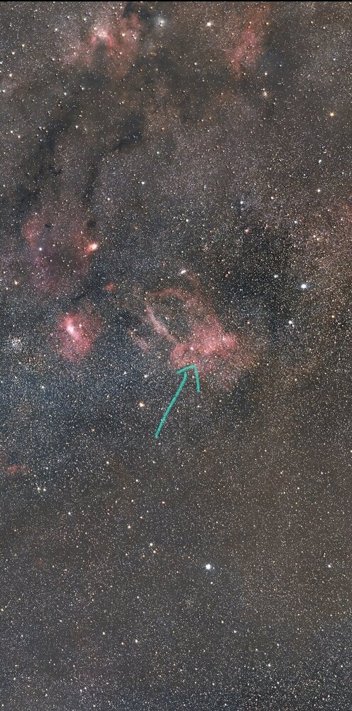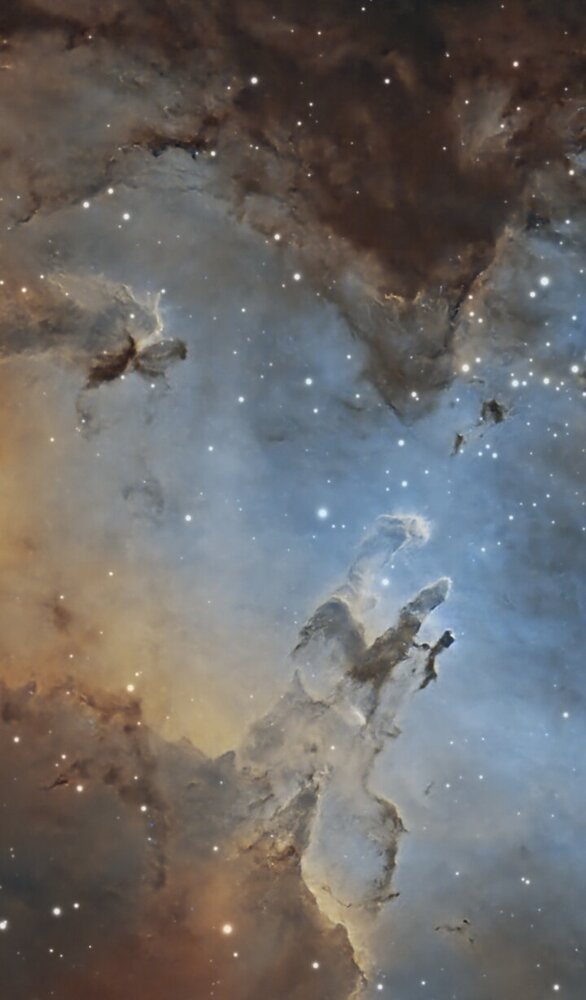 Filtre bibande L extrem et en 2023 (pas l'an passé) C'est au C8 avec un temps de pose assez long (9h) mais à F/6.3 donc pas forcément plus rapide. Là je t'ai juste mis le zoom sur les piliers mais le champ total ressemble au tient. La Palette Hubble permet vraiment de changer les choses. Avant je ne faisais que du HOO et maintenant quasi que du Hubble...