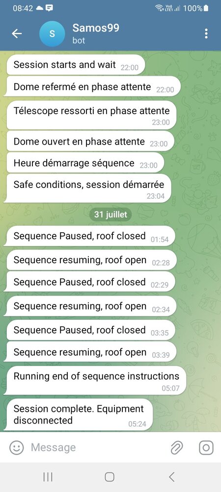 Bon, 2eme nuit nickel. Alors ce qui est cool maintenant avec mon observatoire tout automatique c'est que ma station météo (faite maison aussi) m'annonce les nuages et coupe la séquence le temps que ça se redégage. Cette nuit c'était prévu qu'il fasse beau mais risque de nuages. Alors voilà ce que ça donne. Je m'envoie des messages pour avoir un résumé au réveil. Si nuages >10%, je parke et je ferme. Sûrement que je pourrais attendre un peu plus mais bon. Donc hier soir, les nuages sont partis tard donc ma phase de refroidissement s'est faite toit fermé. Démarrage à 23h de la préparation finale et lancement des poses à 23h04 Vers 2h du mat, y a eu des nuages pendant 30min et le matos est rangé, toit fermé Retour aux images à 2h34 puis une pause de 5min vers 3h35. Puis on reprend jusqu'à 5h. Plus une minute de perdue😁😎 Et 4h récupérées cette nuit ! C'est coooool Sam