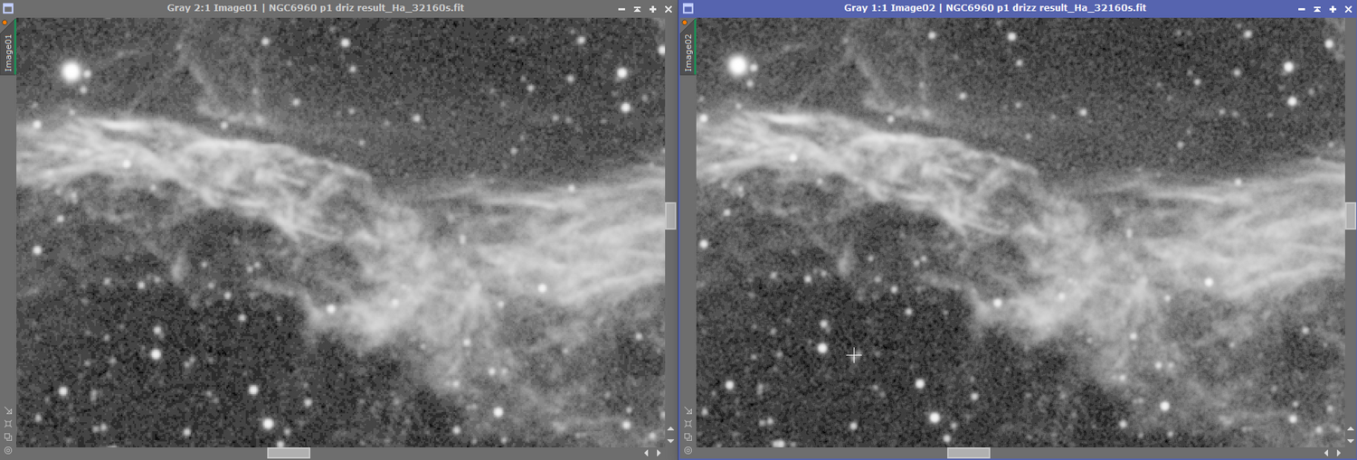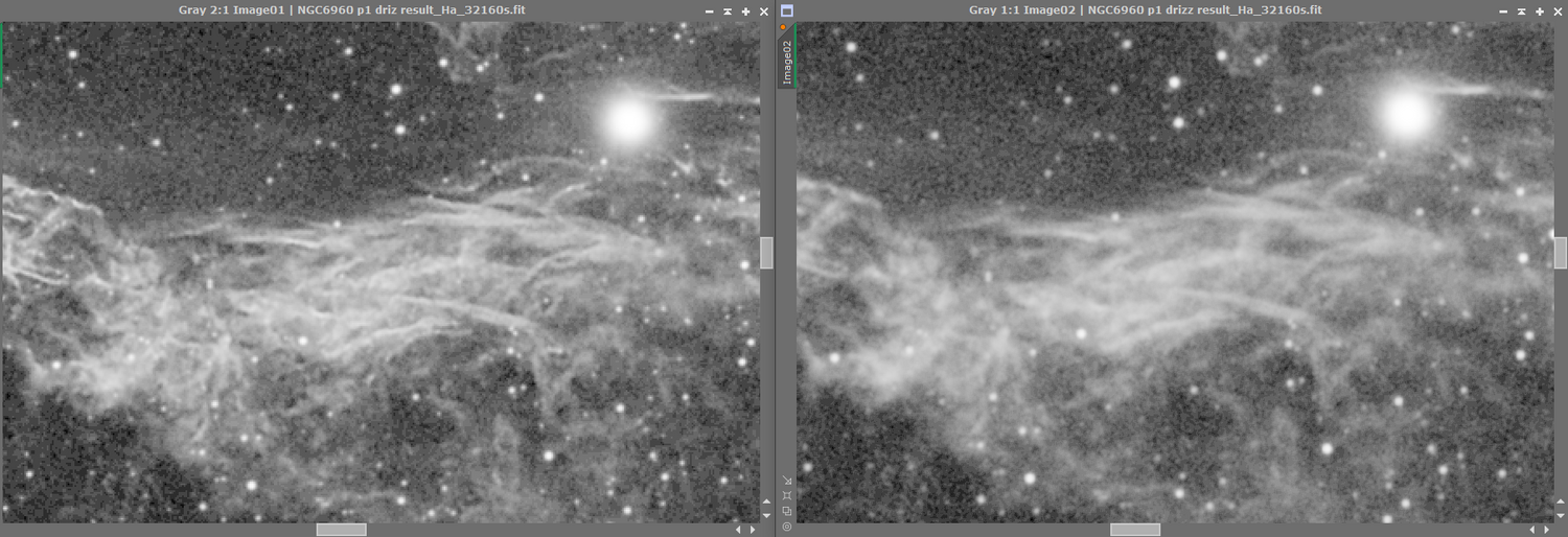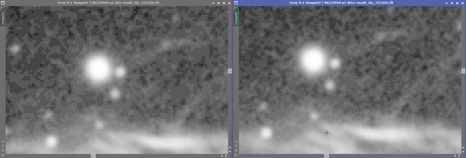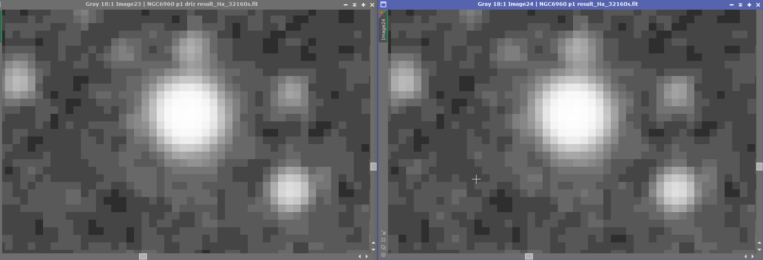 Je fais du dithering toutes les 3 à 5 images pour info Je viens de faire un essai sur une couche Ha avec Winsorised et ça fonctionne : taille double et un zoom sur les étoiles donne le schéma de @krotdebouk A droite le vrai drizzle et sélectionné donc cadre bleu et à gauche sans (y a "driz" dans le nom mais c'est celui qui ne fonctionnait pas) En brut sortie d'empilement : pas facile de dire si c'est mieux Après BlurX Par défaut, le Drizzle fait des choses bizarres en mode sharpen non stellar ! J'ai descendu à 0.5 et c'est pareil. En correct only ça passe mais finalement c'est moins bien que sans drizzlz je trouve en Sharpen non stellar à 0.2 àa commence déjà à merder sur le FDC Donc pour le moment, je ne vois pas d'améloration dans es conditions ici 76EDPH à 342mm et IMX571 Sam