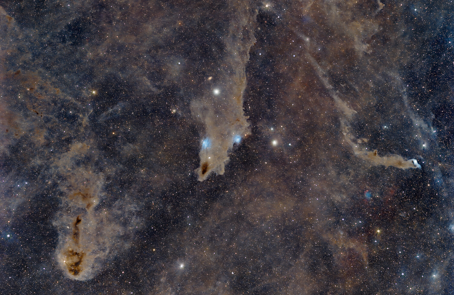 Bonjour, Voici un grand champ centré sur la nébuleuse du requin. Une focale de 300 mm et un plein format permettent de faire également entrer dans le cadre la nébuleuse du poisson pourri et la tanière du loup (personnellement je n'y vois ni l'un ni l'autre ...). L'image est issue d'acquisitions faites en juin dernier sur 5 nuits avec un EOS 6D non défiltré, un Canon EF 300mm f/4 L USM, le tout sur une Vixen gp-2 photo guider (sans autoguidage). J'ai empilé 820 x 90s à 1600 iso. Prétraitement SIRIL, traitement SIRIL, GraXpert, Pixinsight et Darktable. Le résultat la starless Je ne suis jamais très sûr de mes traitements, les conseils et les critiques sont donc les bienvenus