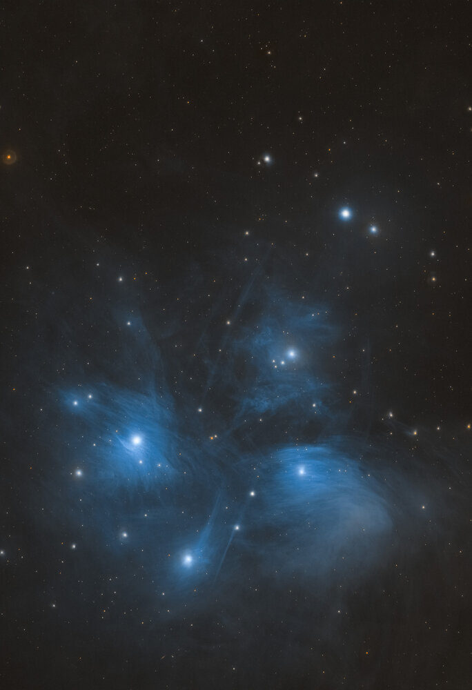 Enfin le retour d'un ciel plus clair... mais malheureusement chargé d'humidité. Néanmoins, j'ai ressorti le matos Monture + FF130. La cible visée : le Casque de Thor, mais comme il n'apparait dans mon ciel qu'en deuxième partie de nuit j'ai en profité pour rendre une visite aux Pléiades. Comme vous pouvez le voir, malgré des temps de poses unitaires assez courts, j'ai de nombreux halos autour des étoiles. Serait-ce dû à l'humidité très présente la nuit dernière ? ou à mes filtres LRVB ? Données EXIF : * Caméra ASI2600MM pro + filtres L/RVB sur lunette ZWO FF130 + réducteur --> focale = 705 mm * Poses unitaires de 30 secondes sur chacun des filtres avec 150 poses en L et 50 poses par filtre RVB * traitement rapide sous SiriL avant de tenter de faire mieux sous Pix. Et pour la suite, sur le Casque de Thor, j'espère que cette nuit sera claire pour faire le Ha... en attendant un petit aperçu rapide de la couche O3...