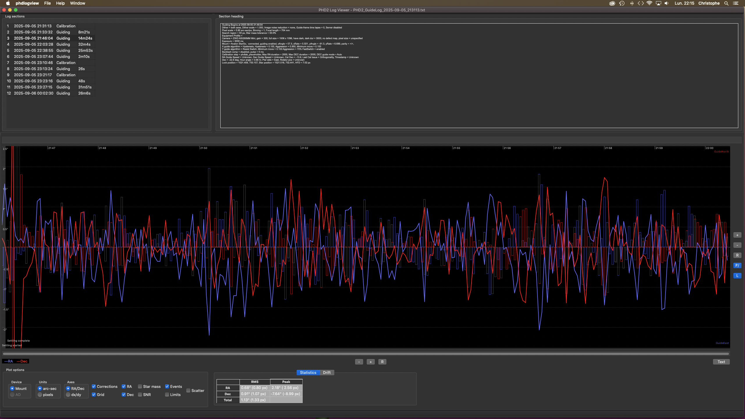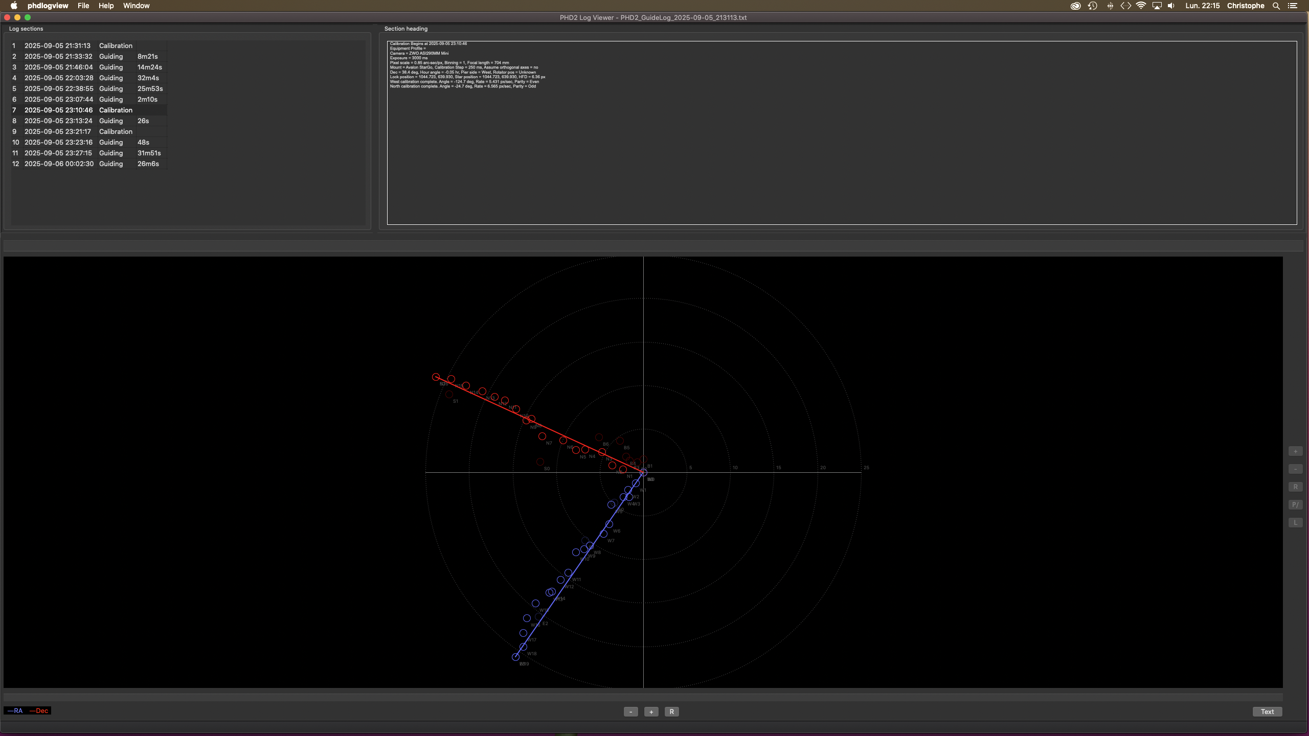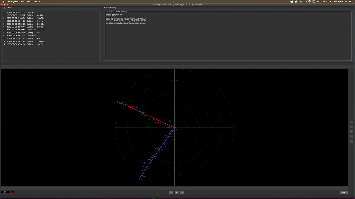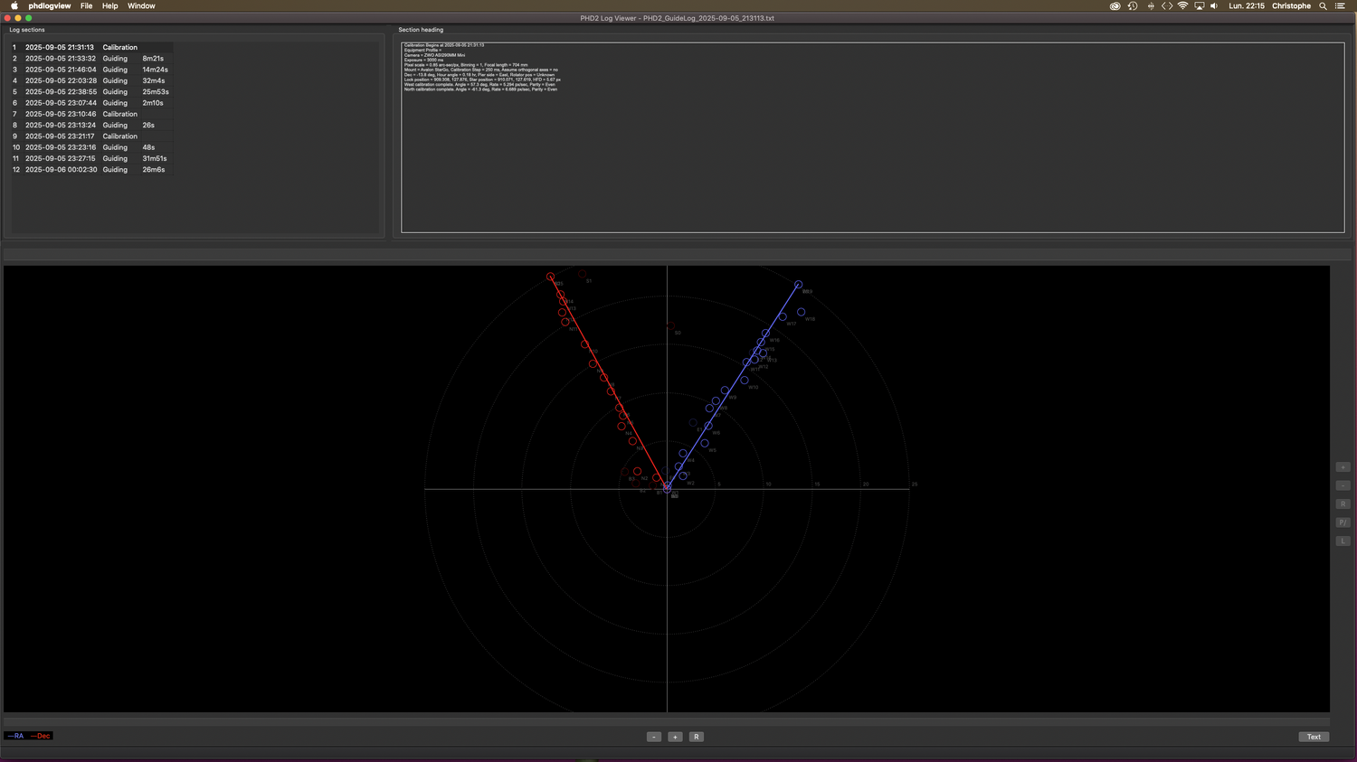 Voici un log typique de ma session... PHD2_GuideLog_2025-09-05_213113.txt En regardant dans PHDLogViewer, je constate que la calibration a donnée des résultats bizarres avec des axes de RA & DEC pas parfaitement perpendiculaire. Je n'avais jamais rien constaté de tel sur ma Losmandy G11... Par contre je suis incapable de pousser plus loin l'analyse, notamment comment mesurer l'EP... -
