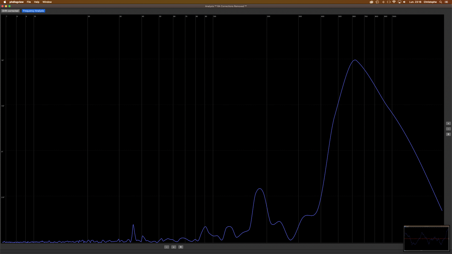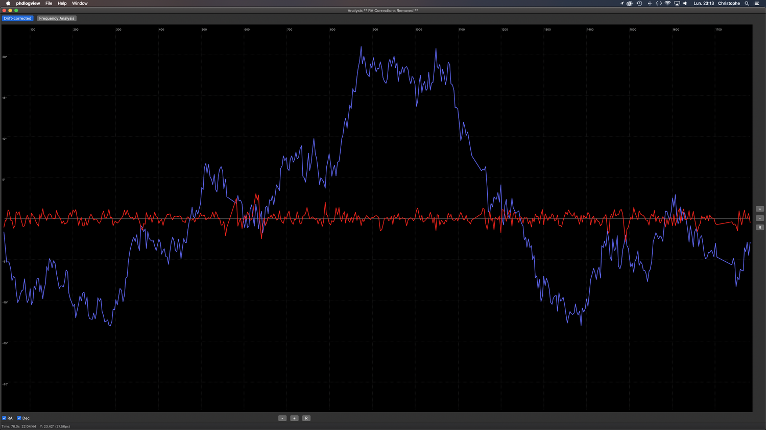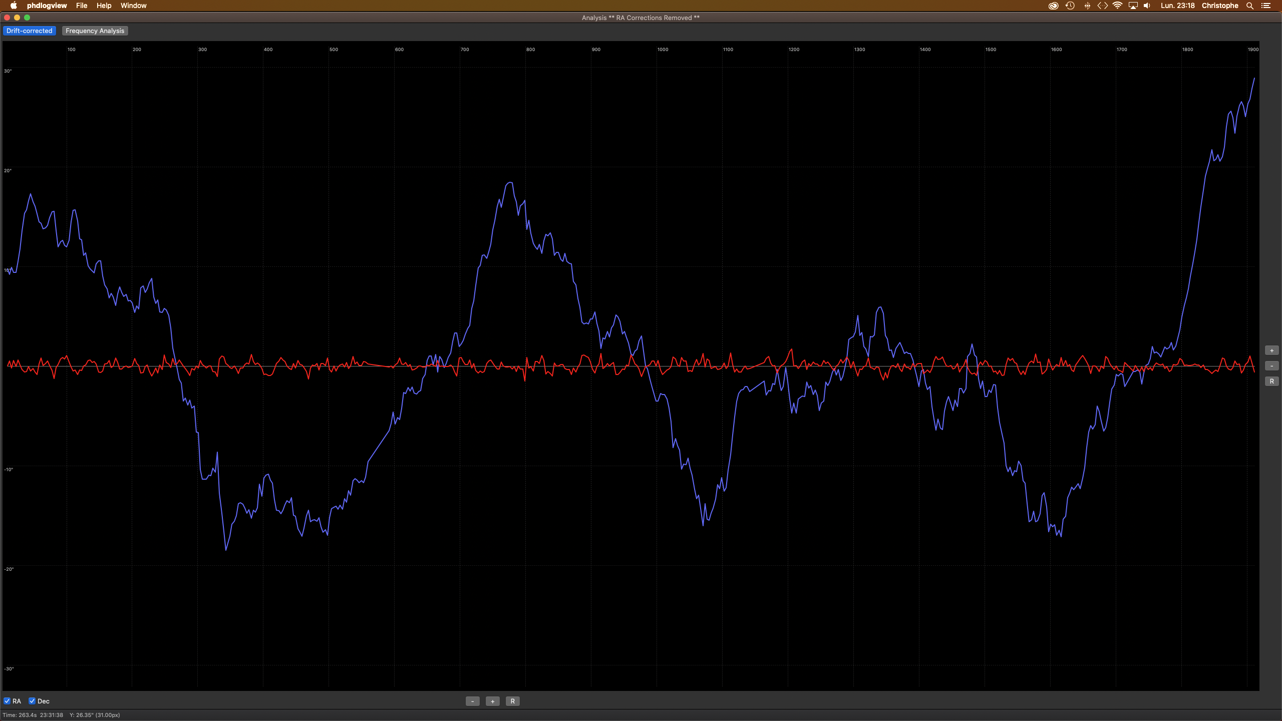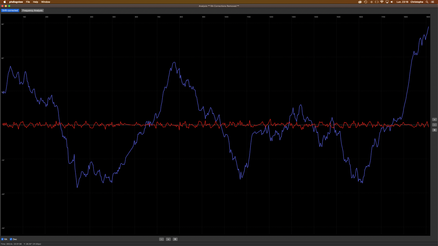 Voici un log typique de ma session... PHD2_GuideLog_2025-09-05_213113.txt En regardant dans PHDLogViewer, je constate que la calibration a donnée des résultats bizarres avec des axes de RA & DEC pas parfaitement perpendiculaire. Je n'avais jamais rien constaté de tel sur ma Losmandy G11... Par contre je suis incapable de pousser plus loin l'analyse, notamment comment mesurer l'EP... -