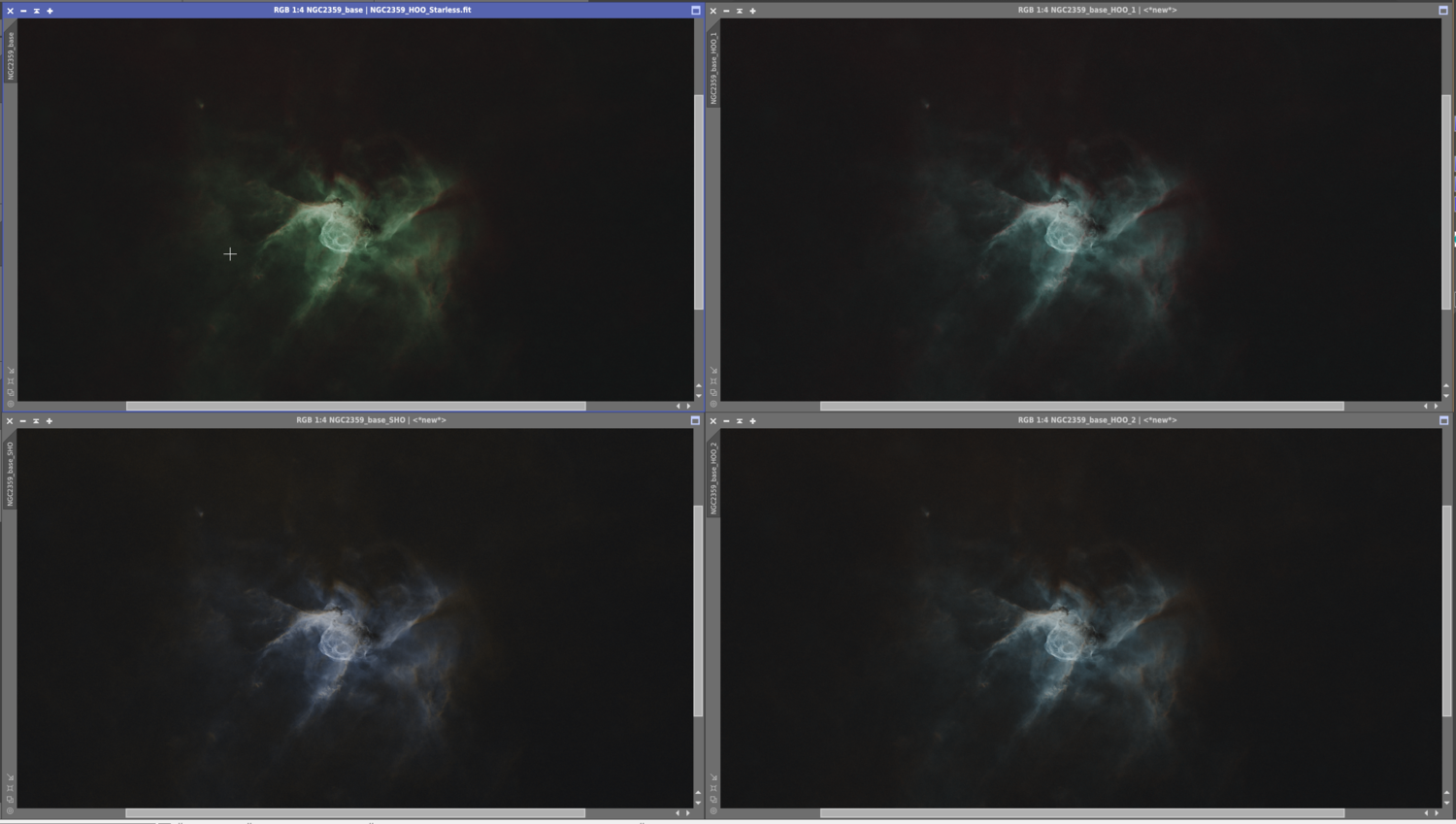 N'ayant pas de ciel clair pour engranger de nouvelles images, je reprends le traitement de certaines de mes acquisitions sous Pix, alors qu'à l'époque je n'avais fait que du SiriL. Je suis reparti des fichiers issus du pré-traitement SiriL de l'époque puis j'ai exploité les nouveaux outils dopés à l'IA : GraXpert pour commencer puis BlurX et NoiseX. Enfin la montée d'histogramme est réalisé avec le processus GHS par touche successive. Les images initiales sont ici : En voici les nouvelles versions toujours en HOO avec une palette des couleurs standard et une SHO 'style'. N'hésitez pas à me faire des commentaires afin de continuer à affiner mon process de post-traitement sous PixInsight.