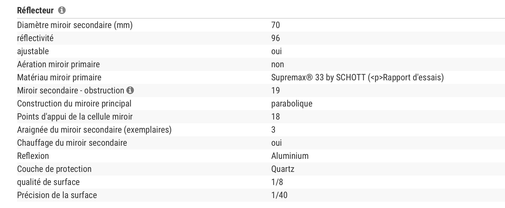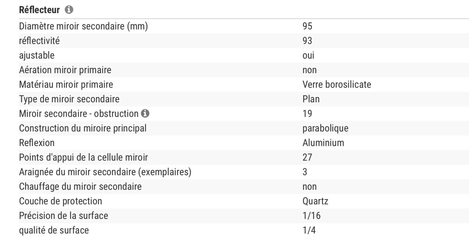 2. WoW, vous êtes hyperactifs ! 😂 J’ai trouvé des renseignements sur le site astroshop, en image jointes. effectivement, la question de la hauteur du bidule est cruciale, car étant sur Grenoble, je doit tout transporter à chaque fois, et je préfère garder un setup « simple », sans escabeau par exemple. Je suis grand, mais c’est pas le cas de tous ceux que j’amène en sortie. Plus les dimensions de transport. je regarderais l’option miroir à part quand même. Disons que Taurus propose une alternative bien construite et pensée pour le transport, une alternative entre le chinois et le sur mesure. Avec des qualités et des défauts, mais venant d’un chinois 150… 🫠 il y a peut-être des concurrents à Taurus, mais je ne les connais pas. (Encore ?) enfin, j’ai le temps de chercher, et d’essayer auprès d’autres astronomes.