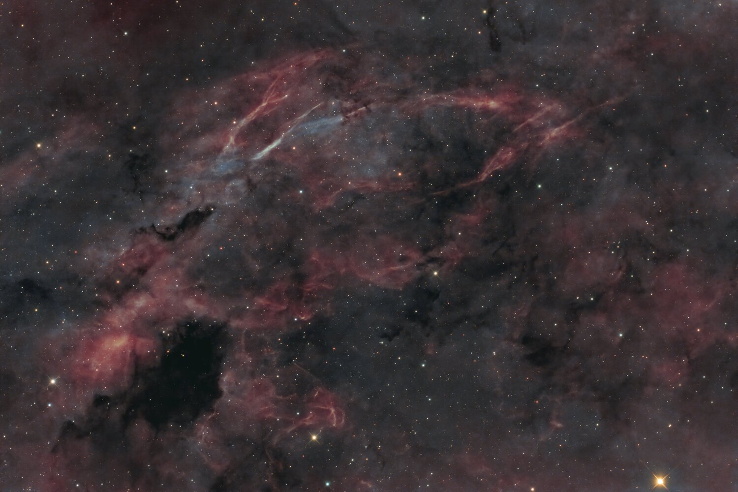 Le cadrage et le format sont un peu inhabituels mais j'aime bien. Les nébuleuses en Pas_SHO c'est sympa aussi ! Pour ton petit soucis d'étoiles qui sera très bientôt un souvenir j'espère, tu peux passer par un starless/starmask puis un masque de couleur sur le starmask. Avec un masque bleu pour commencer et un SCNR bleu ou une désaturation du bleu puis etc... ça corrige un peu le problème.