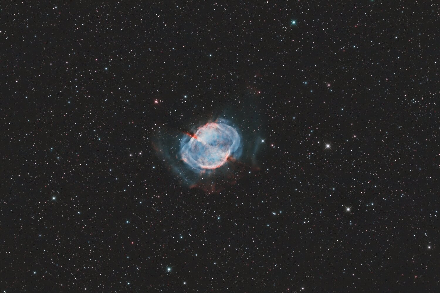Encore une belle nuit que cette nuit ! Direction M27 avec mon RC8 + ASI294MC + filtre duo NB Ha/OIII. Les nuits courtes me permettent de capturer tout juste 100 x 180" (5h). Traitement full Pixinsight_Xterminator et un petit passage par Affinity 2 pour terminer. J'ai trouvé que ça a été une cible parfaite pour ce genre de filtre sur caméra couleur !