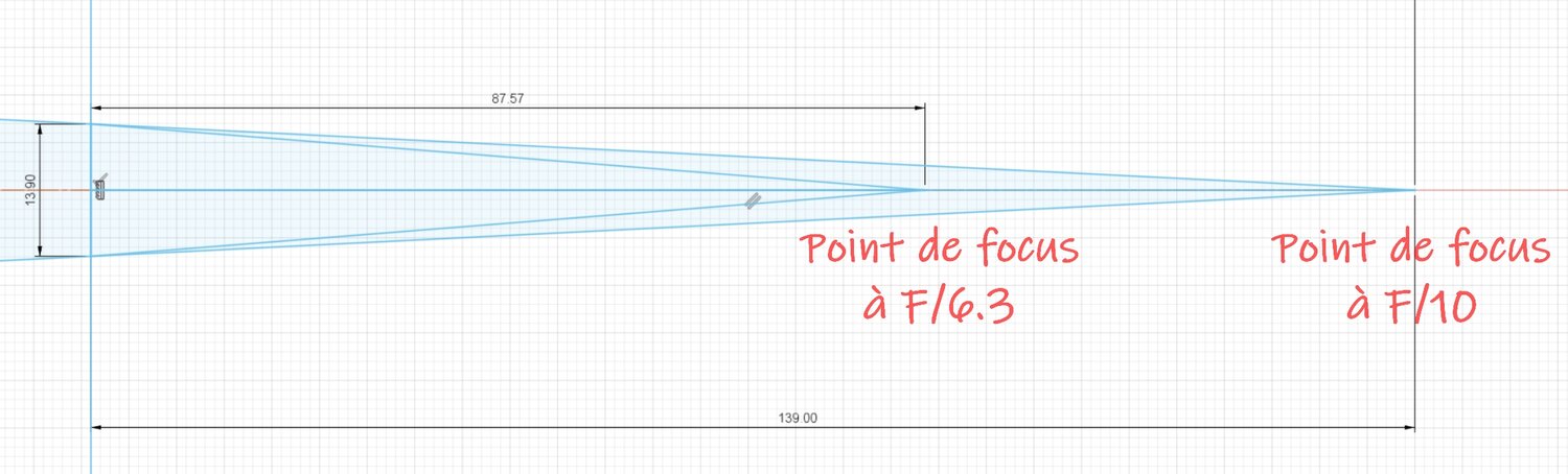 D'après un post sur CN, il conviendra de placer le capteur de ta caméra à 139 mm du "mirror baffle tube lock ring" Je t'avais mis un lien dans un autre post, celui qui concerne la variation de la focale d’un Schmidt Cassegrain avec sa mise au point. Un SCT fonctionne à son optimum à une certaine distance entre le primaire et le secondaire, étoiles les plus fines et aberrations chromatiques au minimum. Cette distance fait varier la focale et la conséquence est que le point de focus varie lui aussi, il est plus ou moins loin de l'arrière du télescope. Si tu respectes les 139 mm en sortie de tube alors tout ce qui précède sera bon (finesse d'étoiles, chromatisme et obtention de la focale théorique de 2350 mm sur ton C9). Le réducteur Celestron a été conçu pour se visser directement à la sortie du tube et avec la bague T + bague de raccordement de l'APN tu obtiens directement le "backfocus" idéal entre réducteur et capteur. J'en profite pour faire un schéma pour m'éclaircir les idées vu que je cherche un peu la même chose sur mon C11XLT.. Avec un C9 à 235 de diamètre et 2350 de focale idéale ça donne ça Un petit zoom : 87.57 et 13.90 mm ne correspondent à rien de réel, c'est juste pour tracer un cône de lumière à F/6.3 (87.57/13.90=6.3) à partir de l'arrière du télescope en partant des 139 mm de distance recommandée. Je te laisse calculer de combien rentre le point de focus à condition que le miroir primaire soit resté à sa position idéale. On voit bien qu'ajouter un Crayford dans le montage peut compliquer les choses au cas où il serait un peu long (le mien fait 92 mm mini.. et en CP il faut ajouter un DO + la distance entre bord de caméra et capteur). L'emplacement du réducteur a des conséquences de par le backfocus qu'il demande (les 90.3 mm du Starizona), il envoie le capteur au delà du point idéal. C'est pour ça à mon avis que le réducteur tubulaire Starizona x0.63 a de l'intérêt puisqu'il se glisse dans le Crayford et permet ainsi de limiter le déplacement du primaire pour retrouver le focus. Ce qui précède devrait te permettre de trouver C'est ma compréhension du SCT et si je me suis gourré, je suis preneur des explications ! -