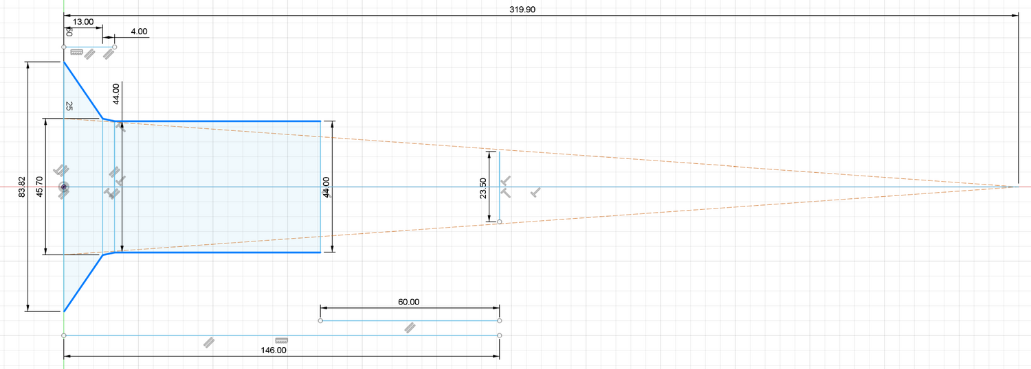 C'est 7 x 45.85 avec 45.85 le Diamètre supposé de la lentille, c'est pour tracer un cône de lumière à F/D = 7, le facteur de réduction du Starizona LF. Finalement si je comprends bien, c'est 45.7 mm ce diamètre de lentille donc il faut retracer un cône de lumière en fonction de ça mais 0.15 mm d'écart ça ne va pas changer grand chose (45.7 mesuré / 45.85 supposé de ma part). J'ai fait confiance à l'illustration d'un vendeur de matériels astro pour les dimensions du capteur... Ca ne change rien au montage C'est à dire qu'elle a un filetage 3.3" femelle vers un filetage mâle 2" et le diamètre intérieur côté 2" est de 45.7 ? J'ai refait le schéma sur cette base. En bleu gras, l'intérieur des bagues à la géométrie près mais c'est bon puisque ce sont les diamètres mini. Par rapport au cône à F/D = 7 ça passerait tout juste (45.70 / 319.90)... Au pire ça ne va pas vigneter à mort. La lentille doit même être un peu rentrée dans le réducteur donc le cône est à faire translater un peu vers la gauche ce qui a tendance à assurer encore plus le coup. Plutôt que des calculs d'une trigo un peu ancienne maintenant, j'avais fait ce genre de schéma pour une modif Lunt de lunette solaire https://solartelescopeviewingimaging.blogspot.com/2013/10/mike-will-soon-be-adding-description-of.html
