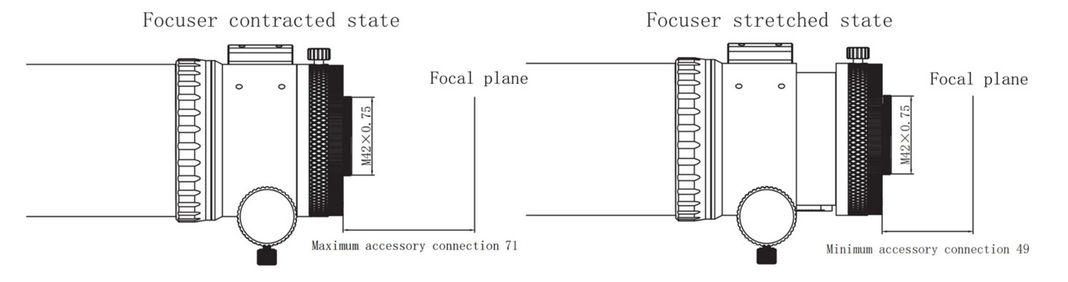 Salut ! Non ce n'est pas un problème, pour moi au moins. Tu vas probablement utiliser une bague Canon/T2 pour raccorder ton APN. Sauf erreur, le tirage interne est de 44 mm sur un Canon reflex, ça te laisse 5 à 27 mm pour la bague T2 qui fait souvent aux alentours de 11 mm d'épaisseur de mémoire (49 ou 71 - 44). C'est pas parfait ça ? https://www.sharpstar-optics.com/Products_1/22.html#saf-detail-1 -