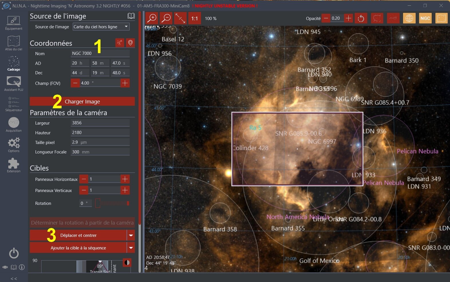 Si il ne voit pas grand chose c'est peut être pas étrange que l'astrométrie foire ? Oui tu peux faire ça pour la MAP mais après il faudra remettre ta monture en position initiale de park et serrer les freins. Sinon, l'ordre de ce que tu décris me semble correct. Plus précisément pour déverminer les choses pas à pas : Connecter ta monture à Stellarium Connecter ta caméra et ta monture à Stellarium NINA Pointer une zone avec étoiles depuis Stellarium, affiner manuellement si besoin (raquette, commande virtuelle dans NINA) Lancer des acquisitions en boucle depuis NINA sans enregistrer, visualiser et faire la MAP Enregistrer une, deux ou trois images MAP faite et les poster sur le forum Parquer ta monture (pointage vers la polaire, contrepoids en bas) Pointer une étoile dans Stellarium Acquérir ses coordonnées dans NINA, charger image, déplacer et centrer (1, 2, 3) Si ça foire, pas la peine de continuer, quelque chose déconne et TPPA ne fonctionnera pas puisqu'il utilise l'astrométrie.. Quand ça ça fonctionnera, il sera temps de passer au TPPA mais là je ne t'aiderai pas, je n'utilise pas. Je l'ai fait une fois pour voir et comparer la MES par rapport à ce que je fais avec mon Polemaster et je continue avec mon Polemaster. Toutefois, je n'ai pas le souvenir d'un truc compliqué, j'ai juste cliqué pour le lancer et faire la MES. Il y a ce tuto Youtube :
