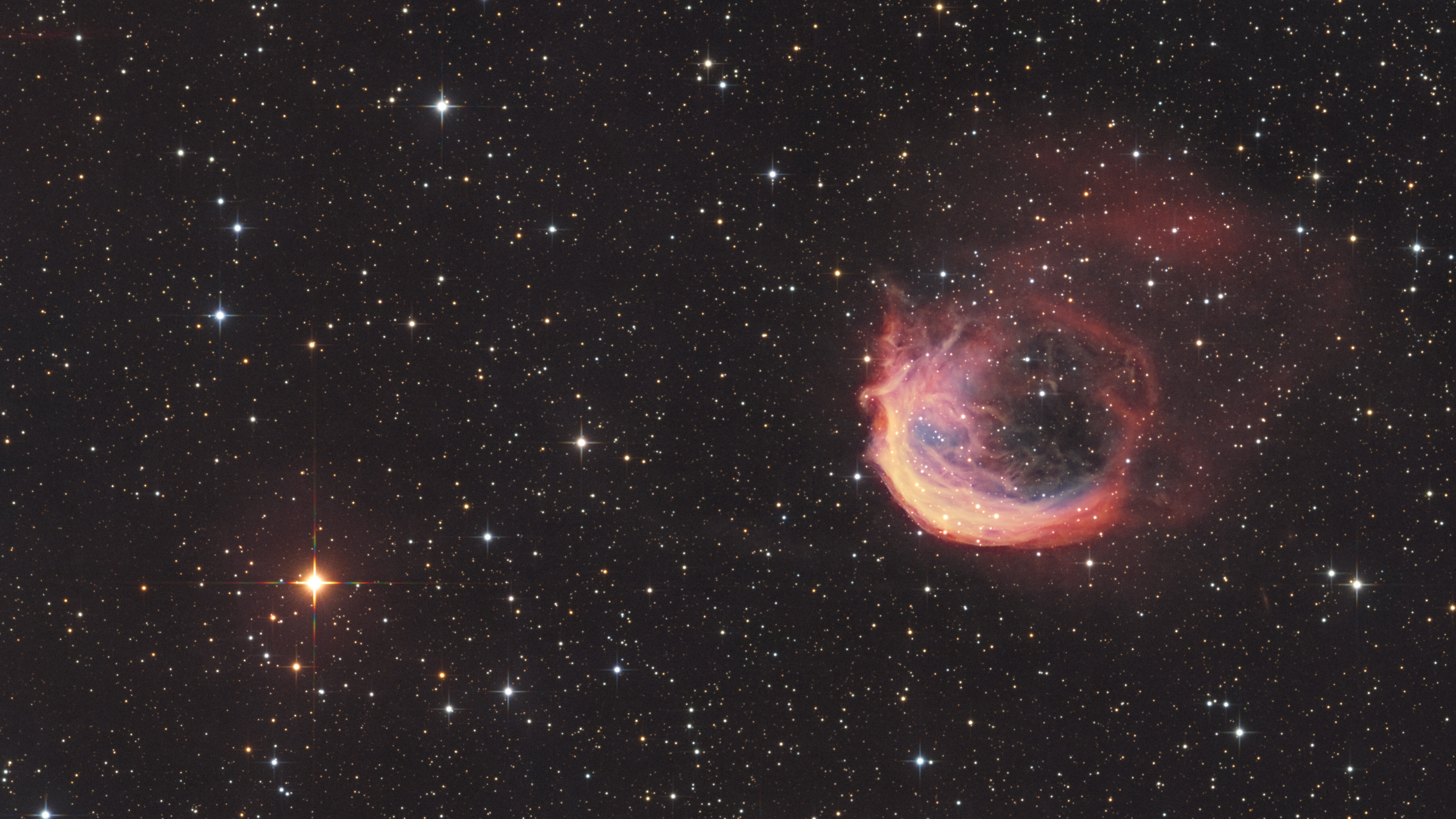 Salut à tous ! Je vous présente une M57 express dans le sens où je ne l'avais pas vraiment prévue et qu'elle ne compte que 2 heures de poses. Initialement c'était pour paramétrer NINA suite au passage de ma miniCam8 sur mon C9 + réducteur Starizona x0.63. Premier coup de bol, tout a marché au premier voyage et le deuxième, les nuages prévus ne sont pas arrivés. J'ai donc (encore) visé M57 et lancé 80 x 45" en L (1h) et 30 x 45" sur chaque RVB (22'30" chaque) en mode Linear HDR. La montée d'histo a été un peu pénible et donc un bon moment plus tard, voilà M57 et IC1296 sa voisine de photo. Comme à mon habitude, NINA, Pix et Affinity Photo 2 et setup validé