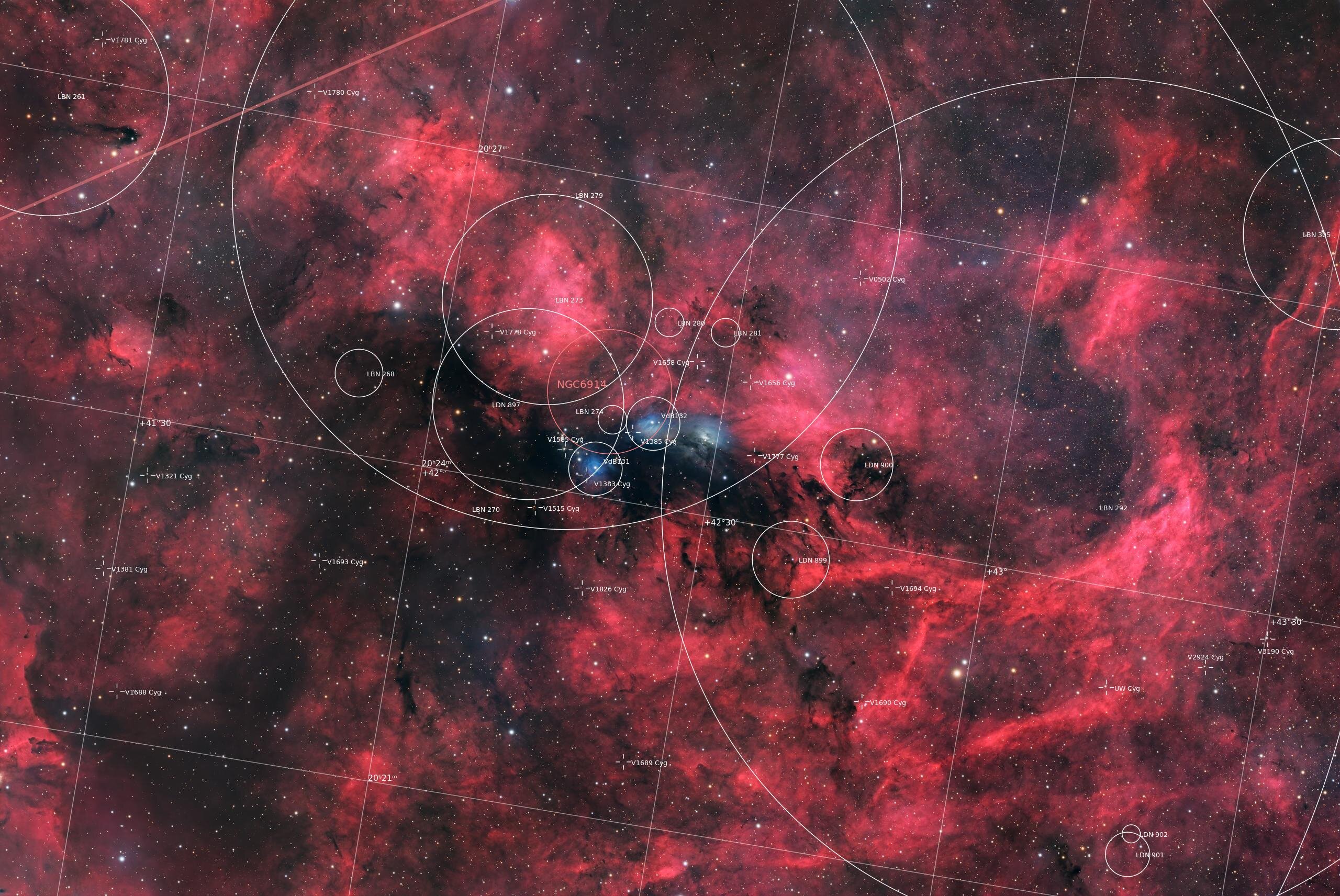 8. Bonjour à tous, Avant de partir en vacances ce jour même, je prends le temps de poster cette nouvelle photo issue de notre setup en Espagne. J'ai découvert ces cibles il y a peu de temps, et me suis extasié devant tout ce rouge (qui d'ailleurs est accessible en RGB simple, pour ceux qui voudrait l'imager) : ni une ni deux, la cible était configurée dans Target Scheduler. Valentin n'a pour le moment pas eu le temps de la traiter, mais comme d'habitude nous retrouverons son traitement en fin de ce post, quand il l'aura publié NGC 6914 et ses compagnes : nébuleuses enchâssées dans le Grand Rift Le complexe NGC 6914 est un véritable joyau niché dans le Grand Rift de la Voie lactée, une bande sombre de poussière qui scinde notre galaxie en deux dans le ciel d'été. Il fait partie d'une région HII bien plus vaste, la nébuleuse Gamma Cygni (IC 1318), illuminée par la supergéante Sadr (Gamma Cygni), bien que cette dernière soit en réalité plus proche de nous que la nébuleuse elle-même. Un foyer de formation stellaire au sein du nuage moléculaire du Cygne Située à une distance estimée entre 3 700 et 6 000 années-lumière, la région de NGC 6914 est un site actif de formation d'étoiles. Le nuage moléculaire massif du Cygne, l'un des plus proches et des plus étudiés, sert de réservoir de matière pour la naissance de ces nouvelles étoiles. Cette image, traitée en LHα-RHαGB, révèle de manière spectaculaire la richesse de cette zone : l'hydrogène alpha (Hα) en rouge intense trahit les zones de gaz ionisé, tandis que les nuages de poussière bleus (vdB 131 et vdB 132) diffusent la lumière des étoiles environnantes, créant ce contraste saisissant. Acquisition 🔭 Lunette TS-Optics CF-APO 102, avec réducteur 0.8x (F/5.6) ⚙️ Monture équatoriale Sky-Watcher EQ8-R Pro 📷 Prise de vue via ToupTek ATR2600M 🎯 Guidage via ToupTek GP CMOS 02000 KPB sur OAG 💻 Pilotage via N.I.N.A. ⌨️ Prétraitement et traitement avec PixInsight et Affinity Photo 📅 Du 9 au 26 juillet 2025 🌍 Setup en remote, chez Roboscopes en Espagne Brutes : - Hα : 60 x 300" - L : 72 x 300" - RGB : 3 x 60 x 180" Intégration : 20 heures DOF : - Darks : 101 - Flats : 15 - Bias : 201 Lien vers la full : https://app.astrobin.com/i/5h8aqm Version starless : Petit crop sur les structures centrales de l'image (je n'ai pas voulu cropper plus, si nécessaire c'est faisable sur AstroBin ) : Ce joli tableau est à peindre dans ce coin du ciel : Le traitement de Valentin aka @valdetahiti, sera disponible plus tard, avec un lien pointant vers son futur post ici-même : stay tuned.