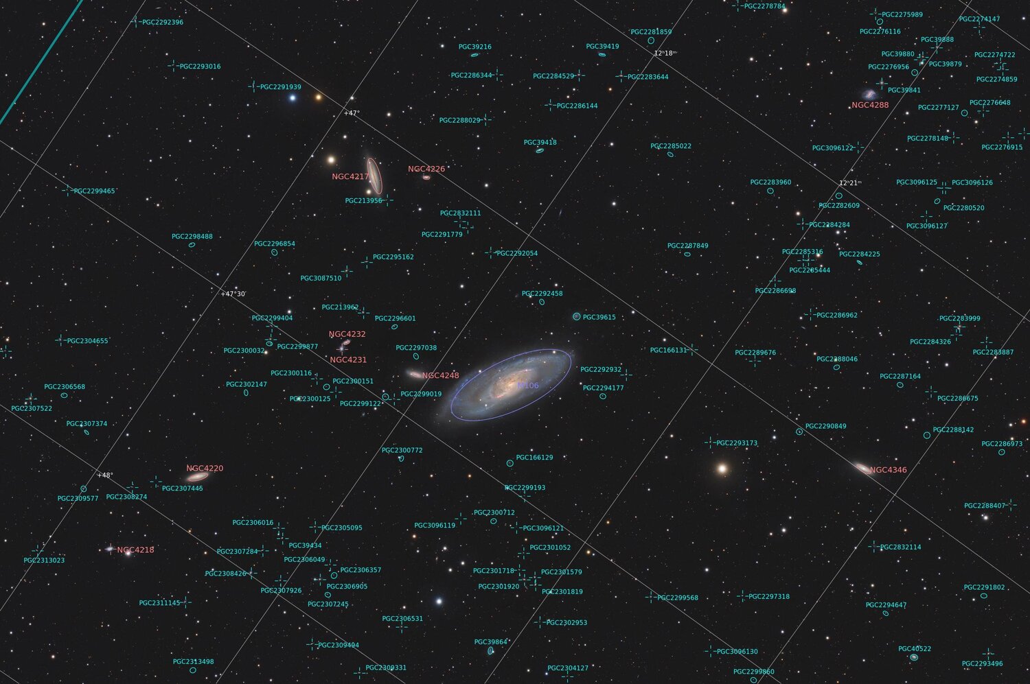 Messier 106 et ses compagnes (LRGBHα - 21h)