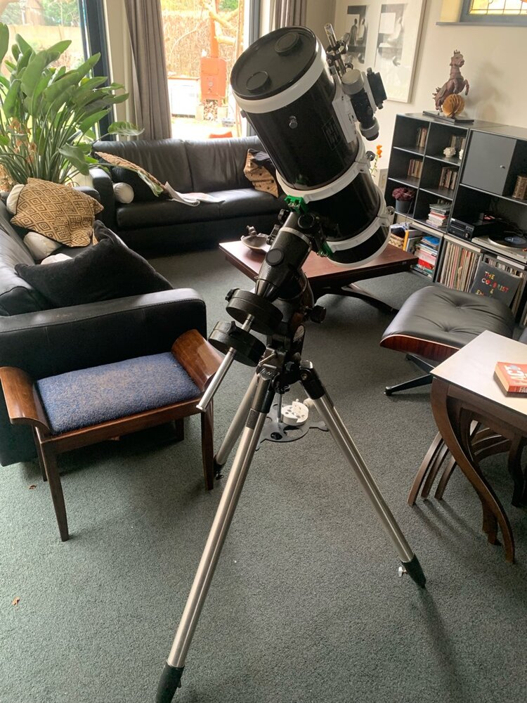 Poue ce qui est de la photo, il faurdrait savoir s'il compte plutôt faire de la photo planétaire ou de la photo du ciel profond. Pour tâter un peu de tout, un Newton 150/600 ou 150/750 sur HEQ5 est intéressant. Le nouveau 150/600 Skywatcher avec correcteur de coma et réducteur est super bon marché si on veut faire de l'astrophoto du ciel profond, et avec une barlow 3x et 5x on peut se frotter à la photo planétaire aussi; le 150/750 est vendu avec la HEQ5 mais il faut encore un correcteur de coma... L'obstruction centrale du 150/600 est assez grande mais il se débrouille néanmoins pas mal en planétaire (et solaire, c'est mon Newton 'solaire' avec filter AstroSolar devant). La focale réduite permet (presque) de faire de la photo du ciel profond sur EQ5 (personnellement je trouve ça un peu limite, le petit Explorer 130PDS se sent plus à l'aise). Il y a bien des gens qui mettent un 150/750 sur une EQ3 et font de la photographie (mais alors de cibles plutôt lumineuses). Pour de la photo solaire/lunaire/planétaire une EQ5 suffit amplement (sauf s'il y a du vent en rafales). Sinon, si c'est plutôt uniquement la photo planétaire qui l'intéresse, je me dirigerais plutôt vers un Dobson 200mm ou 250mm et une table équatoriale. Sinon, on peu également commencer avec une lunette ED80 avec réducteur/correcteur sur EQ5 ou HEQ5; l'ouverture est vraiment petite pour faire du planétaire, mais rien ne dit qu'on voice tout faire avec un seul télescope. pour te donner une idée, ceci est un 150/600 (réduit à 150/517 avec le correcteur/réducteur) sur mon EQ5 antédiluvienne (que je préfère à une monture plus lourde pour sortir le tout vite-vite entre les averses, une HEQ5 avec un tube est moins commode à sortir en une pièce):