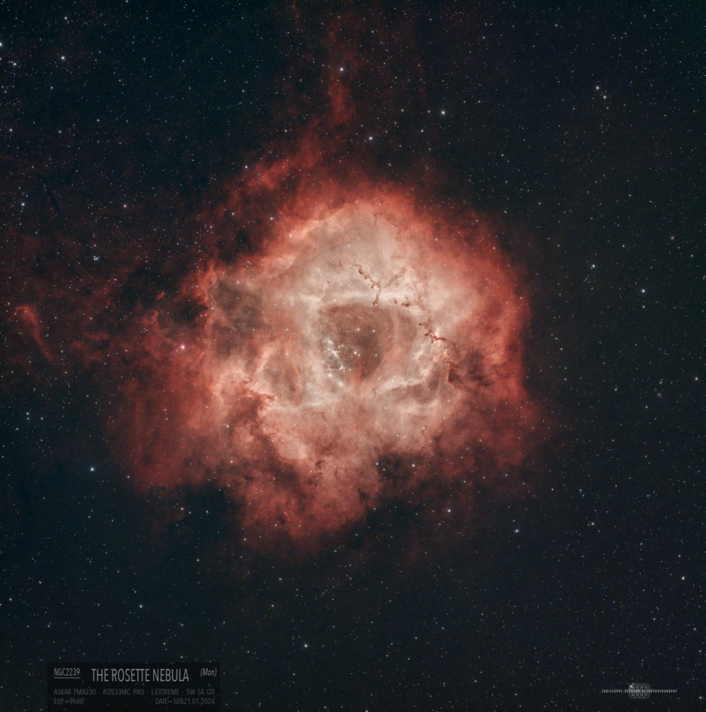 Salut @chinois02, tu as également chez Askar la FMA230, à f4.6 avec son réducteur, qui est vraiment redoutable : champ généreux avec 230mm de focal, piqué des étoiles, chromatisme quasi absent. Je l’utilise avec une 533MC Pro dont le capteur partage les caractéristiques de ta 2600, sauf le format 😉 Echantillonage à 3.37’’/pix. Et pour te faire une idée du potentiel, je te mets une image de la Rosette faîte récemment, à comparer avec la très belle photo de @La Louche du Nord (FRA300 et 294MM). Christophe -