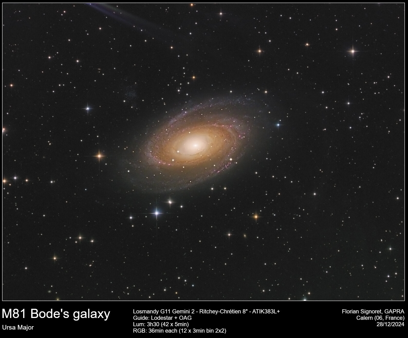 Bonjour, Voici la galaxie M81, surnommée galaxie de Bode, dans la constellation de la Grande Ourse. Malheureusement, un petit reflet s'est invité sur les prises de vue... Réalisée fin 2024, et traitée seulement aujourd'hui, pour cause d'un début d'année un peu mouvementé...