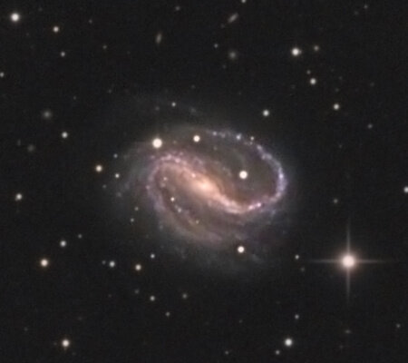 Bonsoir, Selon wikipedia : "avec une brillance de surface égale à 15,60 mag/am2, on peut qualifier NGC 4395 de galaxie à faible brillance de surface (LSB en anglais pour low surface brightness). Les galaxies LSB sont des galaxies diffuses (D) avec une brillance de surface inférieure de moins d'une magnitude à celle du ciel nocturne ambiant." Pourtant elle est très jolie. Elle mériterait donc beaucoup plus de temps de pose, qu'elle n'aura pas, dixit la météo et les contraintes du mode "nomade".