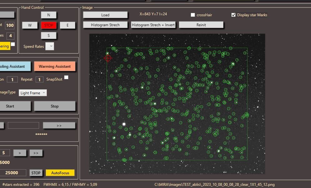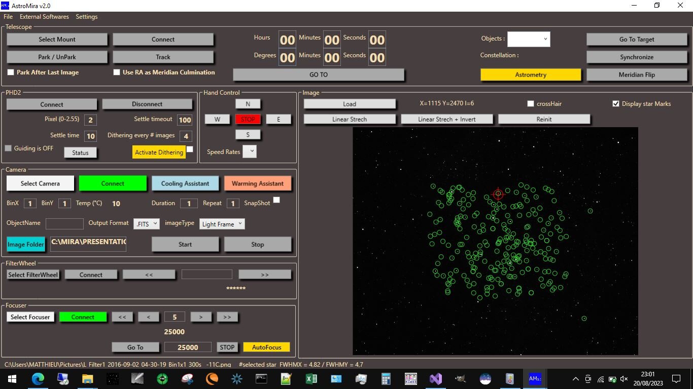 Bonjour à tous J'ai pu apporter des améliorations significatives au logiciel. Le soft répond plus vite : (pour ceux qui connaissent) j ai abandonné la vieille techno backgroundWorkers et j'ai tout implémenté en Tasks. j'ai corrigé pas mal de bugs : désolé pour les personnes qui ont pu rencontrer des difficultés. J'ai ajouté des progress bar : ça rend l'interface plus sympa l'analyse de la FWHM des étoiles est bien plus rapide voire quasi instantanée Du coup l'autofocus peut être utilisé durant la prise d'image. A l'image du dithering avec PHD2 on peut activer l'autofocus toutes les N images. Il suffit au préalable de bien paramétrer le temps de pose, les paramètres de détection d'étoiles (crop, min/max bright pixel) et donc pour cela jouer avec le bouton de test FWHM. D'ailleurs je recommande ce mode avant tous les autres. En exemple, la détection automatique des étoiles et l'analyse de la FWHM sur l'ensemble des étoiles détectées Pour l'autofocus par convergence automatique j'ai pu faire des tests Je suis à F/6 avec un C9 + réducteur de focale. Ici on suit une étoile pour l'affichage mais le système converge en déterminant la FWHM moyenne des étoiles détectées sur l'image. Donc, le focuser avance par pas de 10. A la position 19890 on a une FWHM moins bonne donc, le focuser repart dans l'autre sens par pas de 5. A 19900 la FWHM est moins bonne donc le focuser repart dans l'autre sens avec un pas de 2 et fini à 19896 Tout reste à peaufiner. L'utilisateur devra trouver les bons paramètres entre la taille du pas initial en rapport avec la rapport d'ouverture de l'optique. Une chose est sûre, l'analyse de l'image pour déterminer la FWHM est rapide et permet totalement d'inclure l'autofocus durant le cycle de prise d'image sans que cela ne soit trop chronophage. le retournement au méridien automatique fonctionne correctement. Je l'ai testé essentiellement en mode simulation, mais la routine est fonctionnelle. Donc la aussi, on intègre le retournement au méridien automatique durant la prise d'image et on est tranquille. Comme expliqué précédemment, la procédure de retournement au méridien gère l'arrêt / relance de PHD2, réalise une astrométrie post retournement et un pointage au coordonnées initiales de la prise de vue. J'ai également amélioré la communication avec PHD2. Moins de crash de l'application en cas de rupture de connexion avec PHD2. Je laisse la nouvelle version toujours sur le site astro du club d'Antony https://forum.astroantony.com logiciels / Astromira N'hésitez pas à me contacter si vous avez des questions. Bon ciel à tous. Matthieu