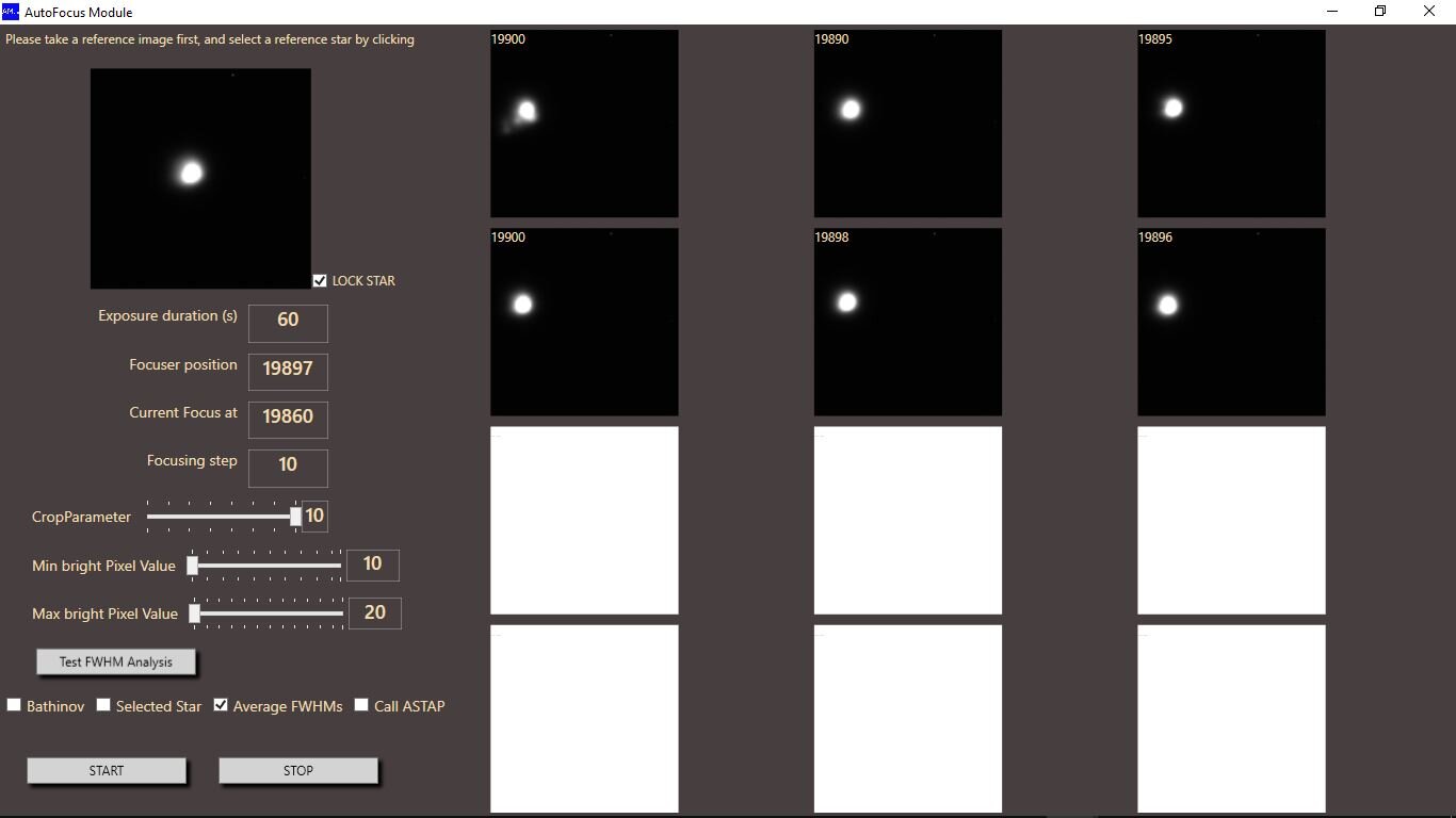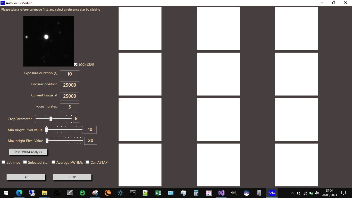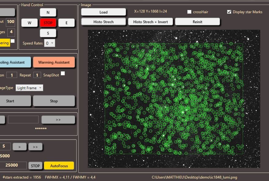 J'ai repris un peu le dev de l'appli notamment sur le module d'autofocus. J'ai bien avancé sur la détection automatique des étoiles de l'image et le fit du profil d'étoile pour déterminer la FWHM. Donc la procédure de mise au point automatique devrait être plus performante. Au lieu de se baser sur une étoile sélectionnée, elle utilisera un ensemble d'étoile de l'image. (Je garde toujours une zone d'exclusion en bordure de champ pour éviter les effets de courbures et gardes les étoiles les plus rondes) Ce module sera plus performant et autonome (plus besoin de faire appel à ASTAP). Je verrai si je mets en place la détermination par V curve par la suite.