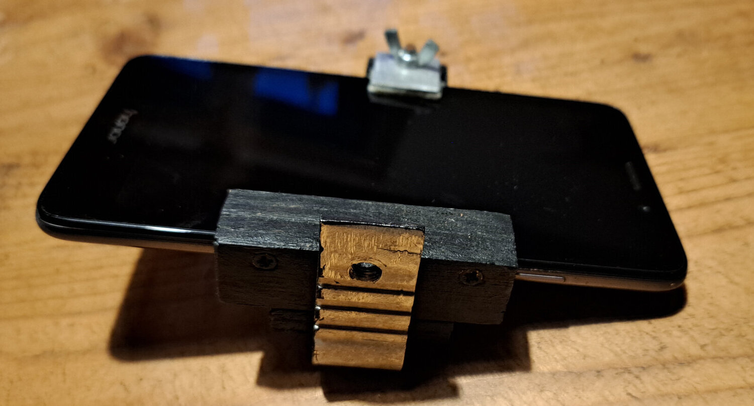 Salut, Avec un peu d'huile de coude, ça se fabrique facile. Trois coups de scie, une peu de peinture, de la feutrine. Pour le pas de vis kodak, soit on a des tarauds, soit on fait un avant trou dans l'alu, et ensuite on passe en force une vis kodak. Ici, un avec un vieux portable. Mais ça passe aussi avec des samsung derniere generation.