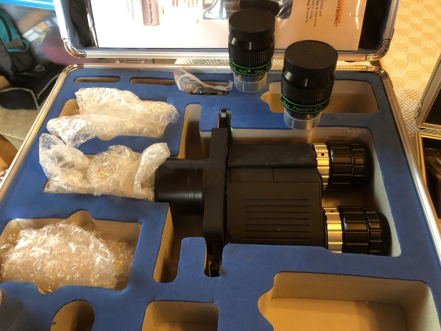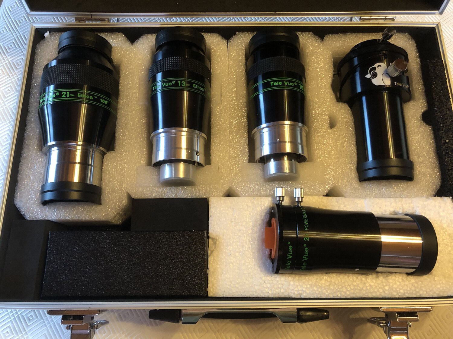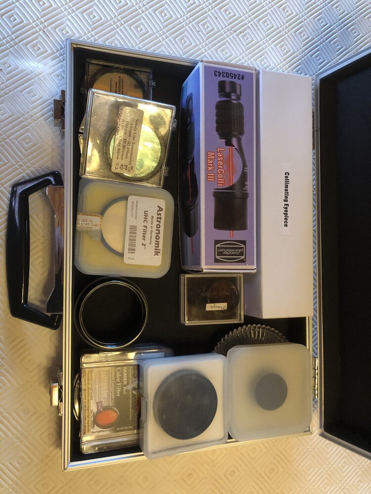 Bonjour, voici les photos de mes modestes mallettes. La première pour les filtres, bagues, accessoires… La seconde avec la bino 🥰 et ses deux Panoptic 19 mm Et enfin la dernière avec les oculaires, barlow et le petit dernier, le Paracorr. Ethos 21 🥰,13, 10. Powemate 2x Barlow TV 3x Paracorr les mallettes sont issues de Brico Dépôt et font le job. Ce matériel est le fruit d’années d’achats, et me permet de profiter des rares soirées étoilées Voilà, la rapide présentation est faite. bonne journée et bon ciel -