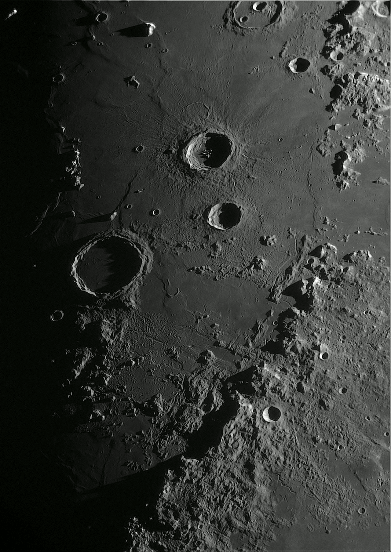 Bonjour, une mosaïque du terminateur (5 images traitées avec IDE) au Newton 200/1000, barlow x3, caméra ZWO ASI 533 (échant. 0.24 "/px). Logiciel AutoStakkert 4.x, AstroSurface, Gimp. A+ GO