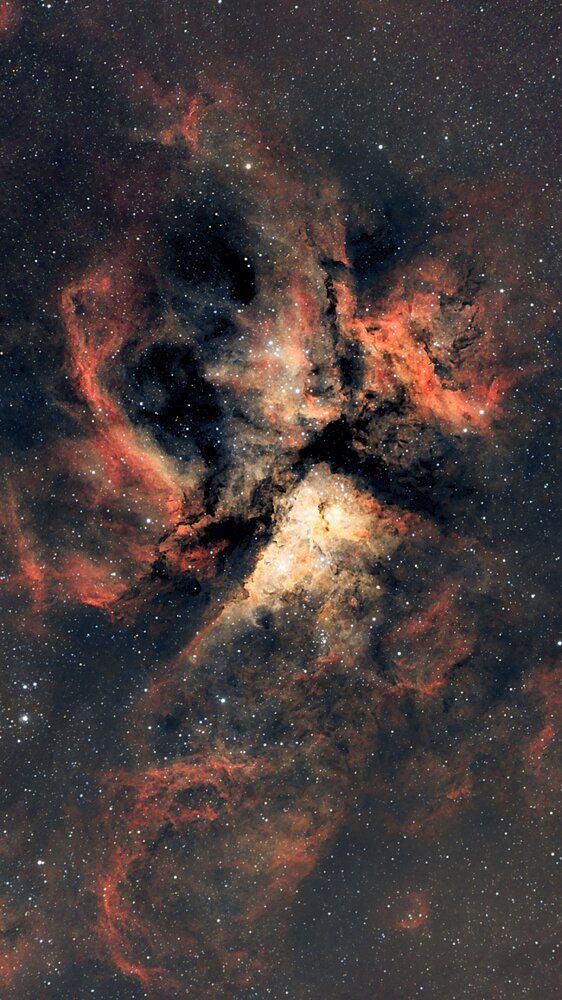 Bonjour à tous. Je vous présente une photo de la nébuleuse de la Carène NGC3372 (en tous cas un morceau, c'est fichtrement grand par là!). 76 minutes de poses faites au Tampon (petite ville peu éclairée du Sud de l'île).