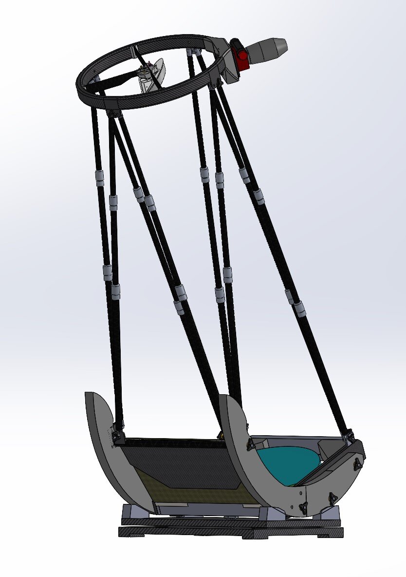 les 3 patins ne peuvent pas etre à égale distance de 4 pieds, c'est mathématique... Le miroir léger n'est pas un pb, il faut simplement composer avec !!! Dans mon cas, je sais déjà que je devrais ajouter du poids malgré de grands tourillons. Qd tu regardes les telescopes commerciaux ils ont des miroirs epais et du poids au cul!! avant de commencer la construction c'est bien de figer les tous les concepts, tu es en train de voir ce que ça donne de tout faire en même temps avec des periodes de doute. La meilleur solution est de lever le crayon et de faire le bilan des masses ; voir quelle taille de tourillon max tu peux accepter puis voir la variation du cog en fonction des oculaires. Ensuite, tu vois combien de masse il faut ajouter au cul. --> le frottement des patins n'est pas nul donc tu compenses un peu de déséquilibre, c'est pas facile à juger. --> contrepoids : combien ? où tu veux les mettre (plus c'est bas moins c'est lourd)? --> ressort/elastique : comment tu les accroches? Yannick -