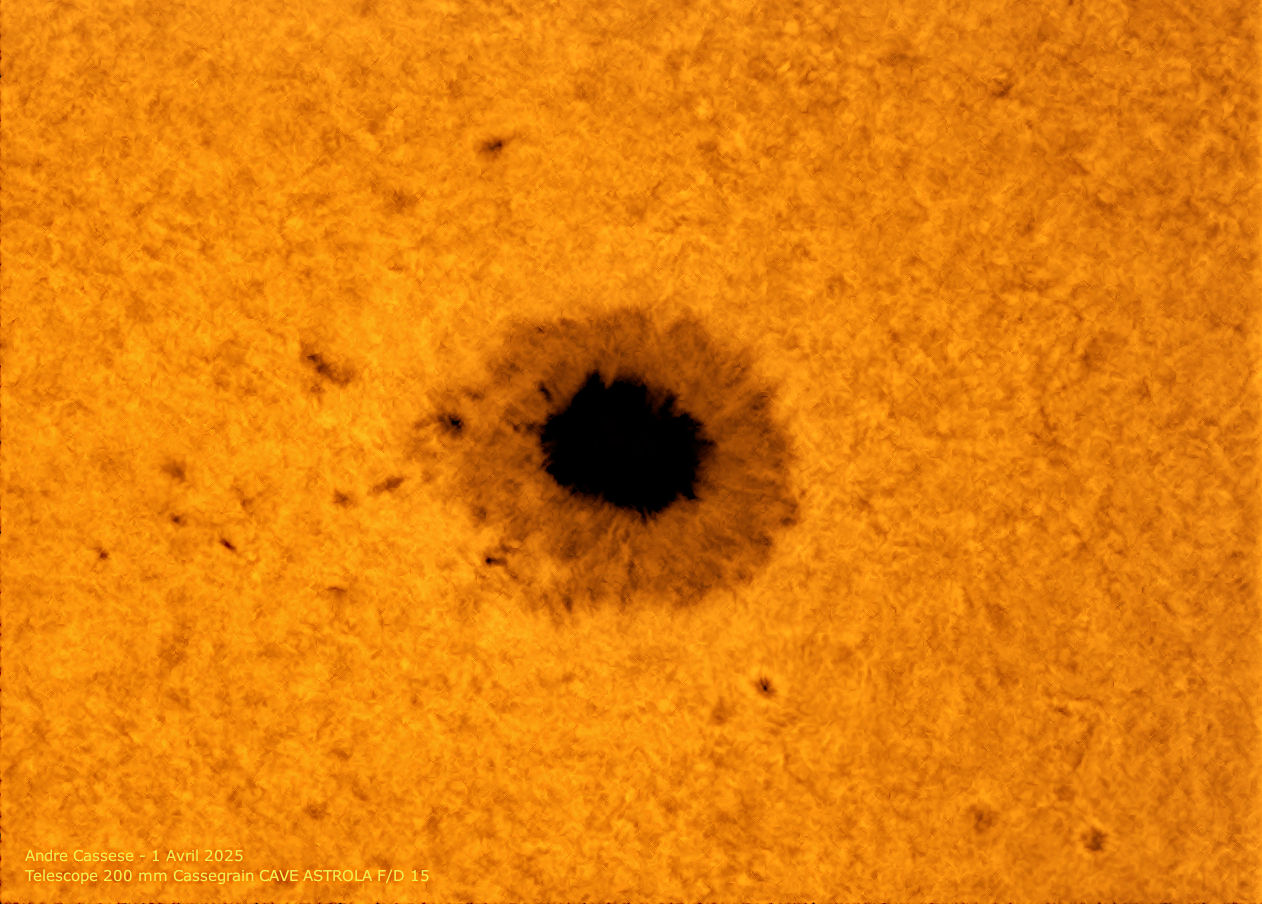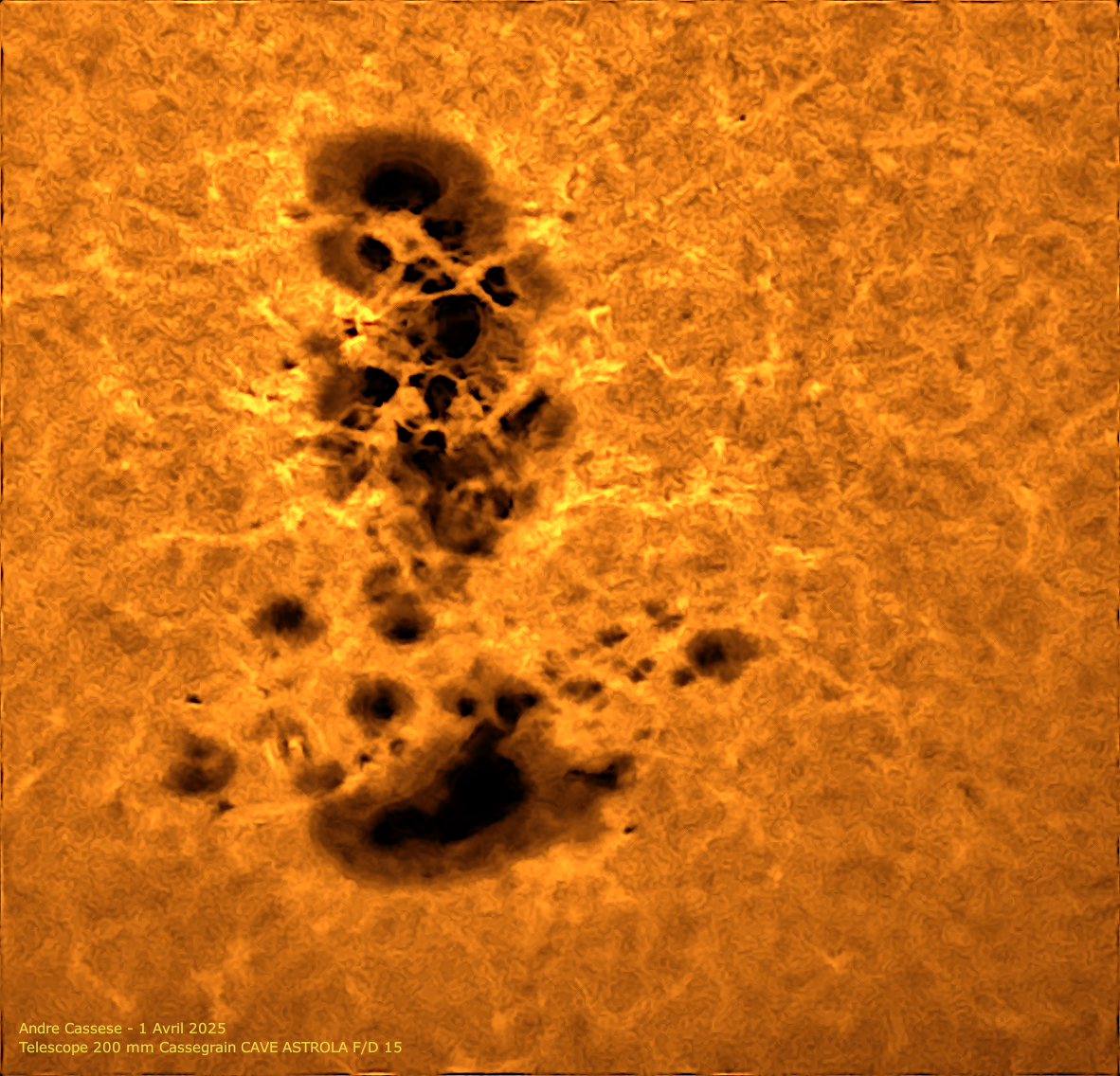 L'excellente stabilité de ce 2 Mai 2025 et une grande transparence de l'atmosphère ont permis d'utiliser le potentiel du télescope Mewlon 250 S avec son filtre Halpha de 230 mm pleine ouverture . Les conditions étaient ainsi réunies pour vous offrir le vertige d'un plongeon a l'intérieur de cette double tache solaire comme Castor et Pollux sur la barque de Ra ! De nombreux détails apparaissent avec une impression de relief étonnant sur une mer de plasma en fureur ! Telescope Mewlon 250 S - Etalon Fabry Perot PST Coronado optimisé prototype - Camera player one photo au foyer de l'instrument soit 3000 mm et ensuite avec barlow 1.3x soit focale résultante de 3900 mm -
