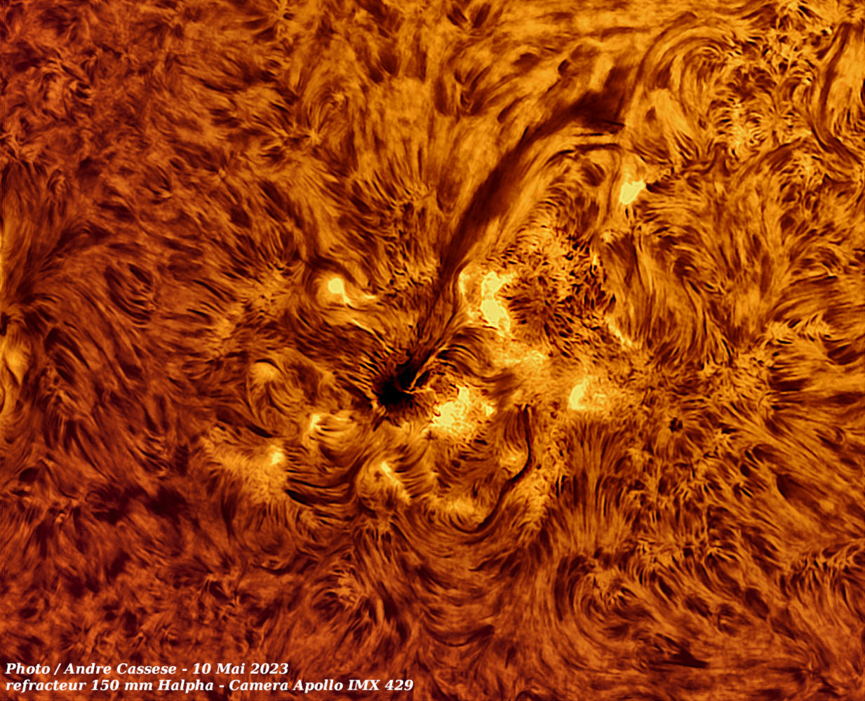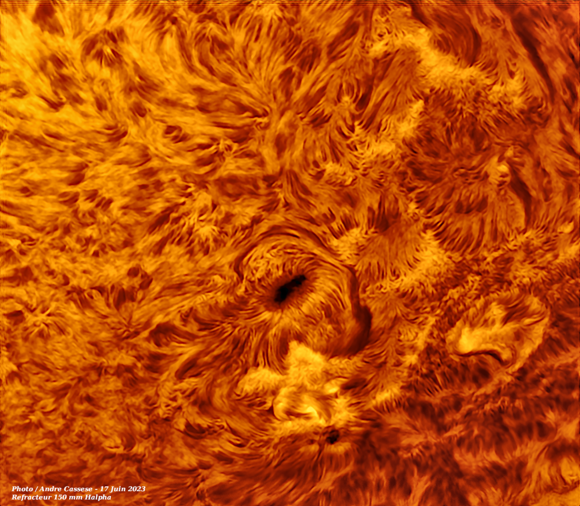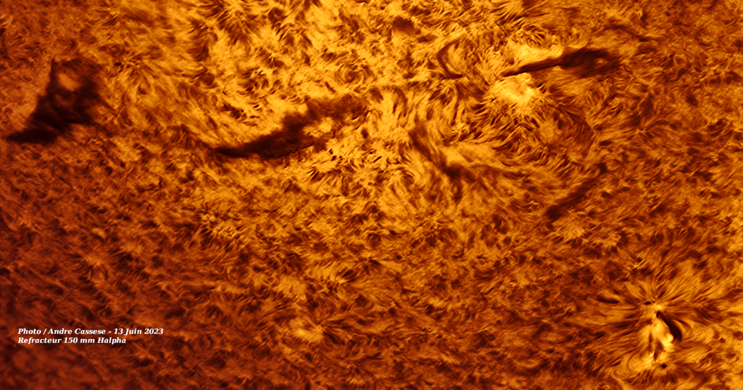 Soleil Draperie et grosse tache solaire 24 Mai 2023 Lunette 150 mm Halpha
