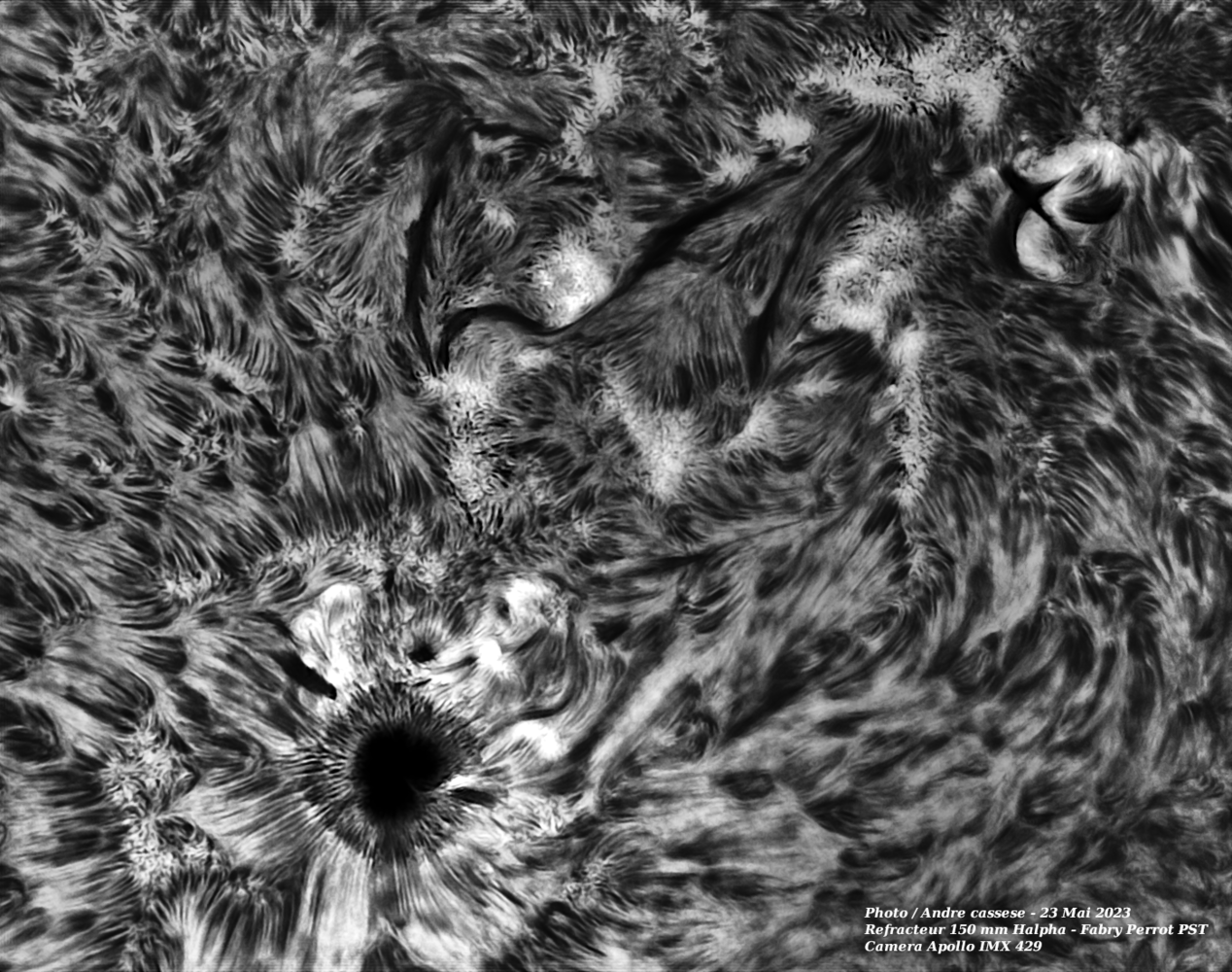 Ce 24 Mai, une magnifique draperie au bord du limbe et la grosse tache toujours aussi fascinante avec une plongé au coeur de cette immense tache en doublé Fabry Perrot PST modifié par mes soins. Lunette de 150 mm apo Halpha - étalon PST coronado prototype et optimisé de 2004 Camera Apollo IMX 429 barlow 2.5 x -