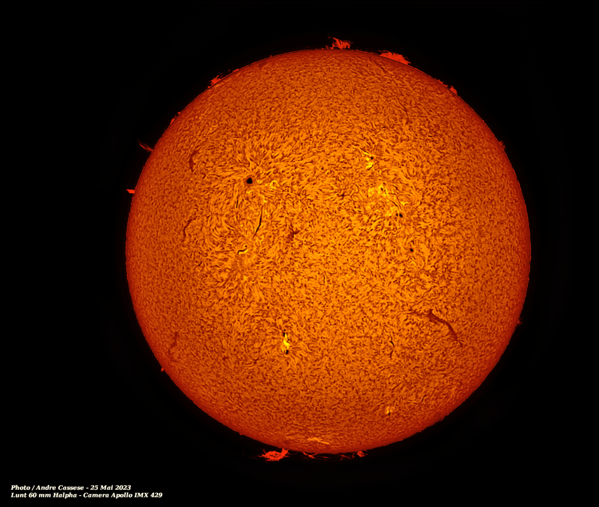 Le beau spectacle du 10 Mai avec la Lunette de 150 mm halpha et étalon PST optimisé prototype de 2004. Camera Apollo IMX 429.-
