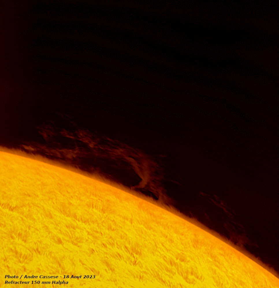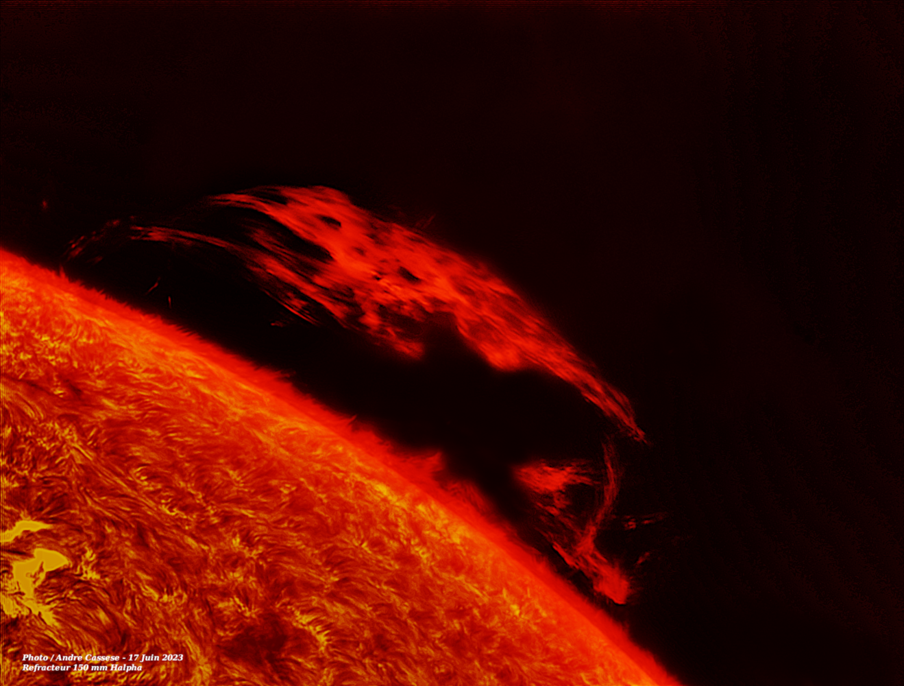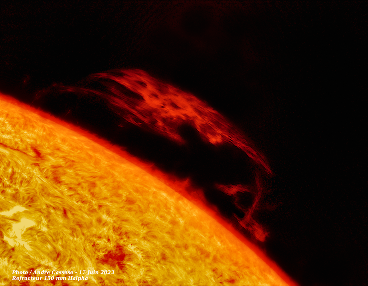 Ce 17 Juin 2023, l'activité solaire est intense avec notamment une magnifique et gigantesque arche de plasma sur le limbe solaire.Réfracteur de 150 mm Apo Halpha , Fabry Perot PST Coronado Prototype de 2004 Barlow 2x avec filtre bloquant BF 10, camera Apollo IMX 429 .-
