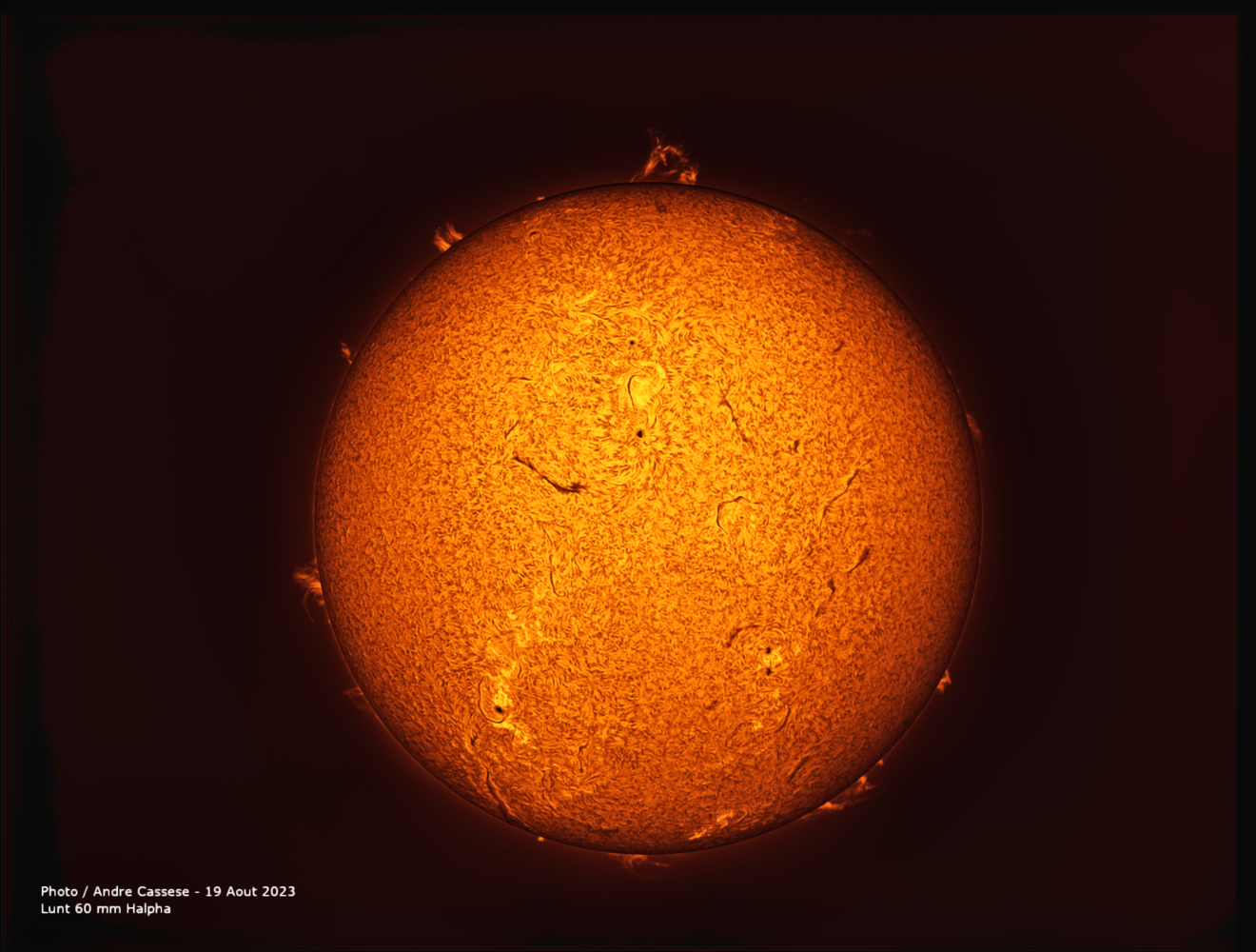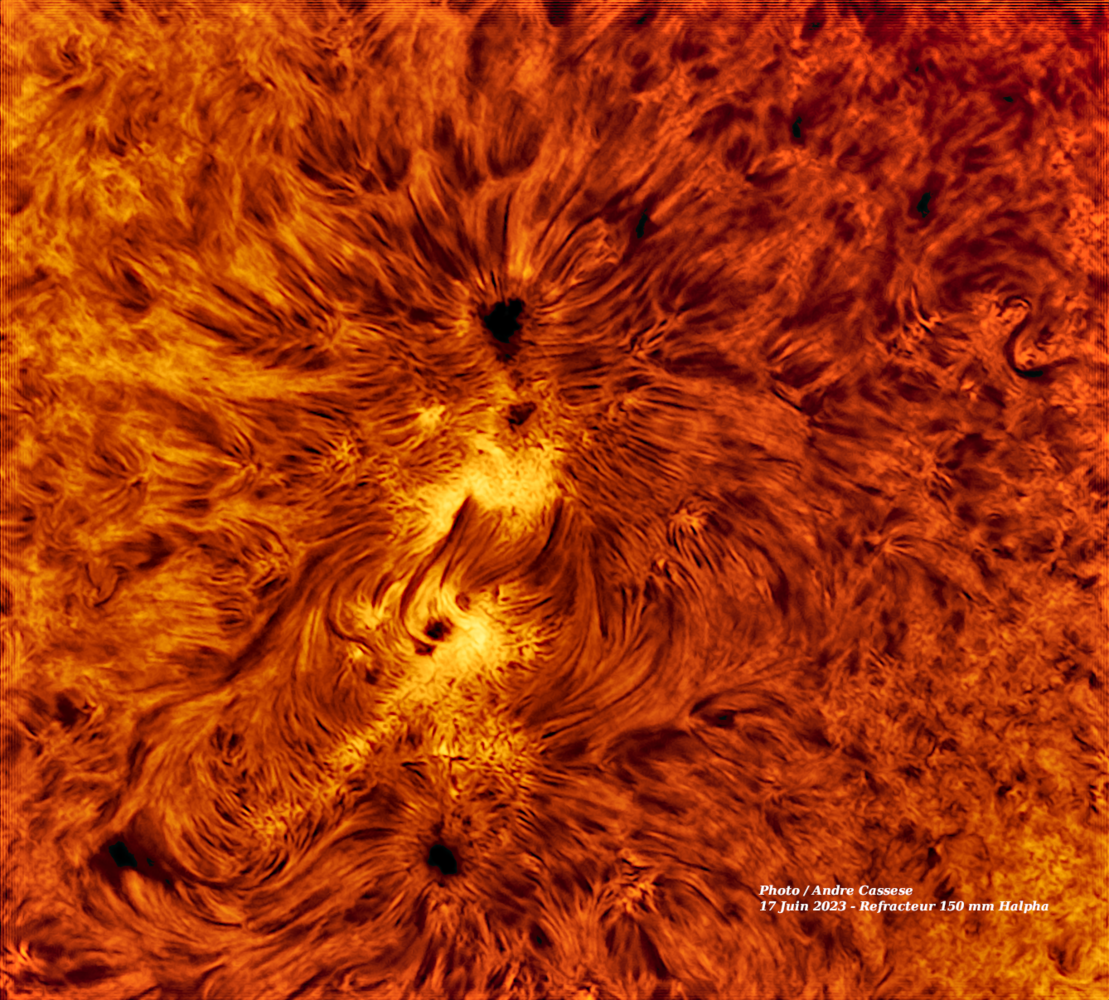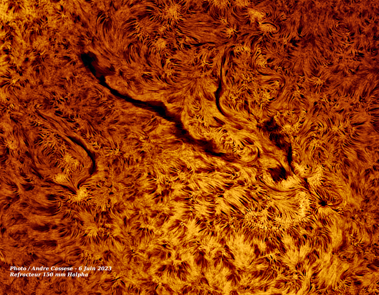 Ce 17 Juin 2023, l'activité solaire est intense avec notamment une magnifique et gigantesque arche de plasma sur le limbe solaire.Réfracteur de 150 mm Apo Halpha , Fabry Perot PST Coronado Prototype de 2004 Barlow 2x avec filtre bloquant BF 10, camera Apollo IMX 429 .-