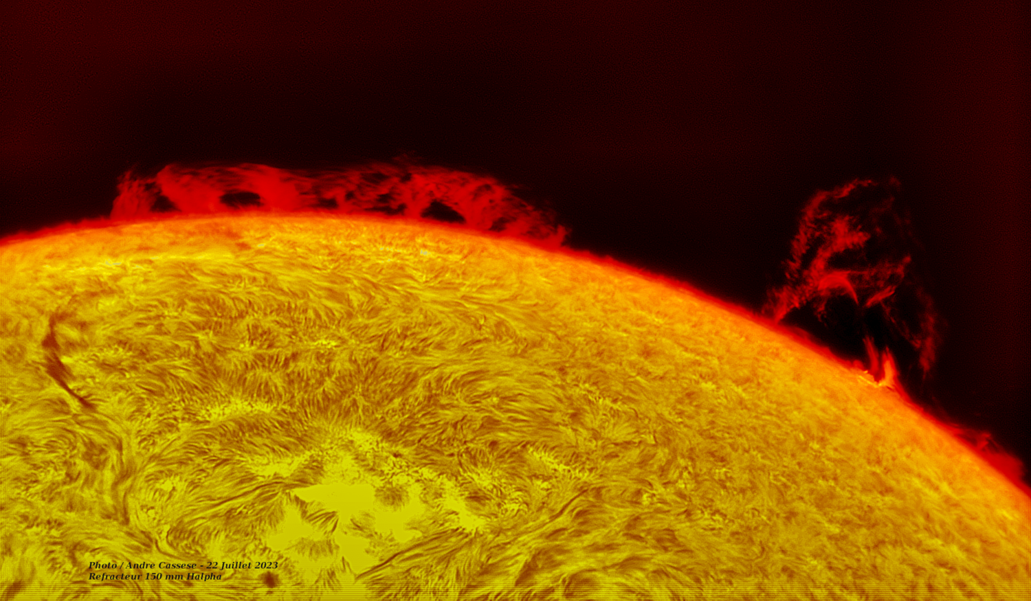 Soleil Grosses protubérances 24 Juin 2023 Lunette 150 mm halpha
