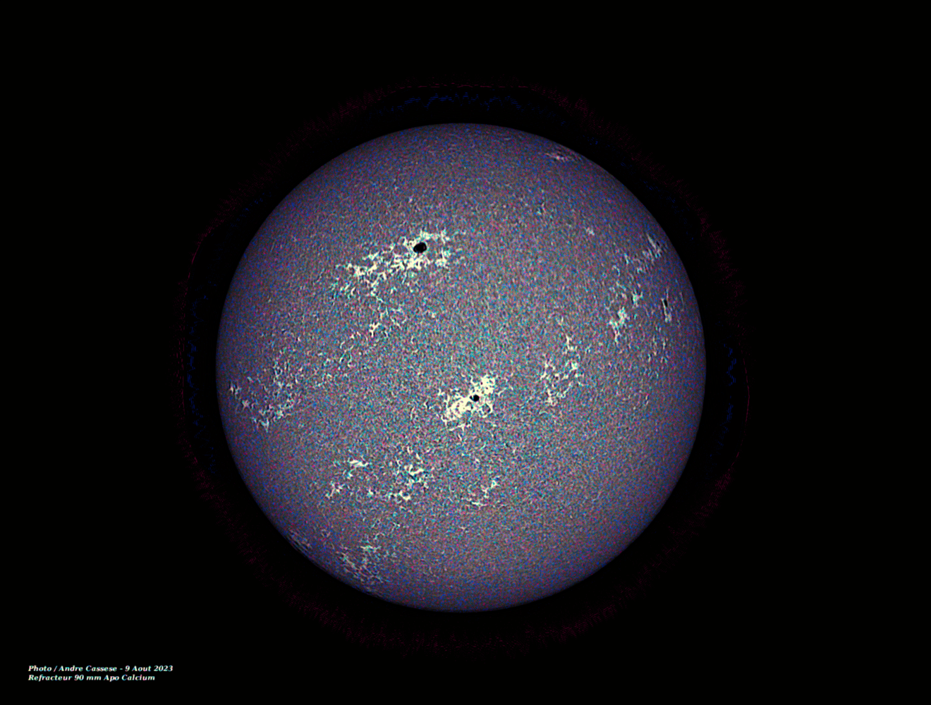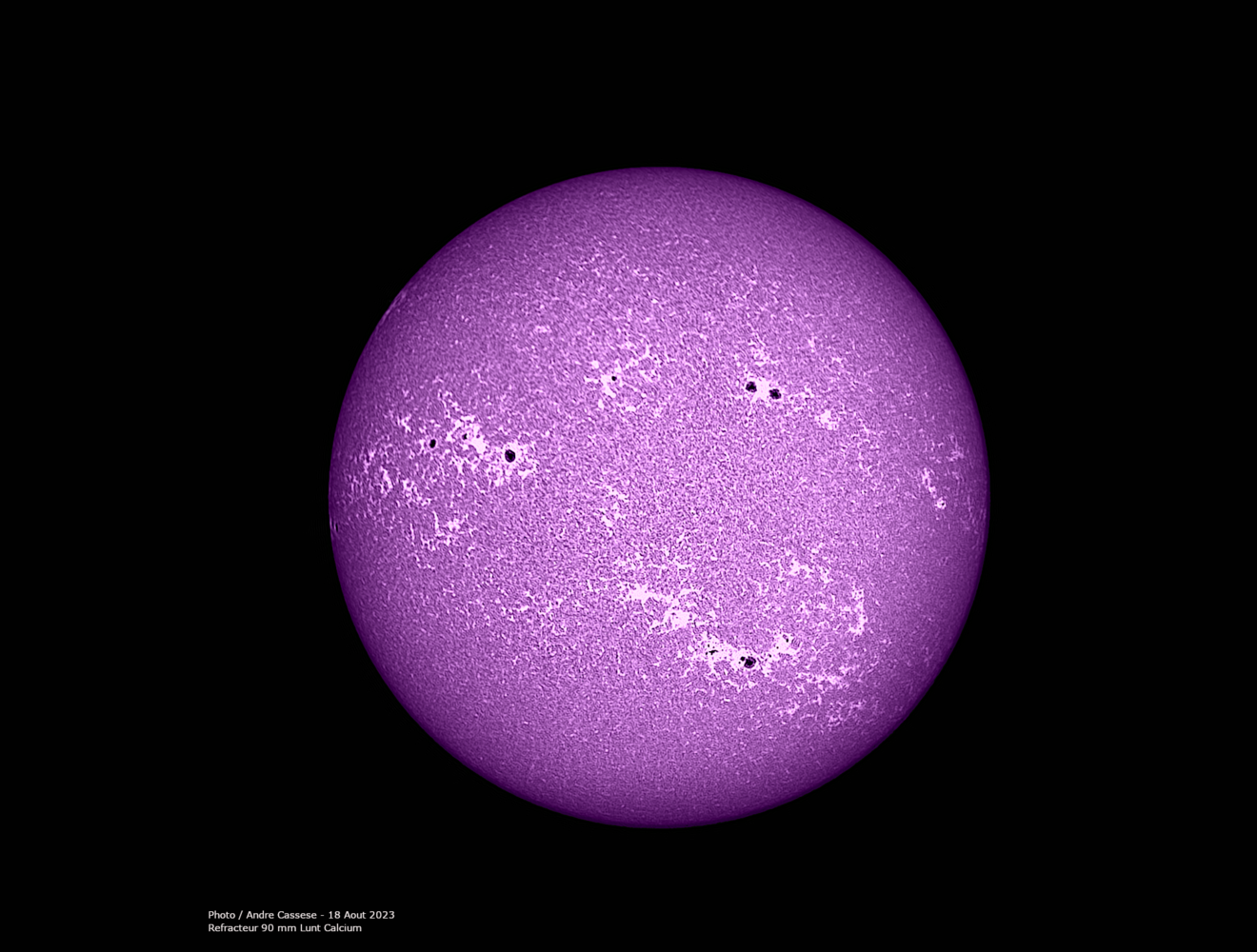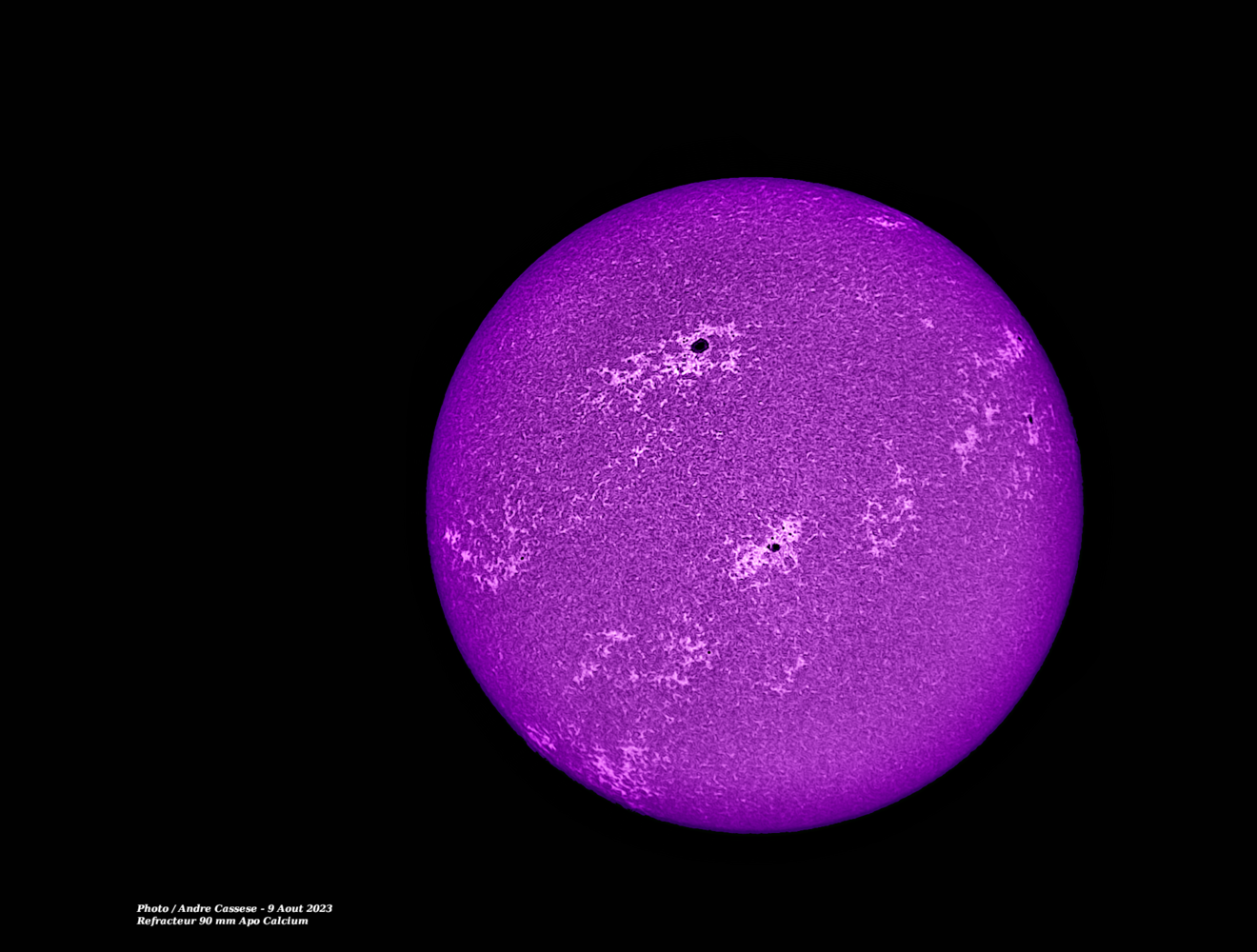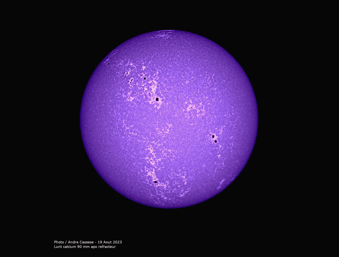 Salut les ami(e)s , voici quelques images du soleil avec filtre Lunt calcium et réfracteur Apo de 90 mm ce 9 aout 2023, cela est complémentaire avec ma lunette Halpha de 150 mm pour observer le soleil sous un angle diffèrent -